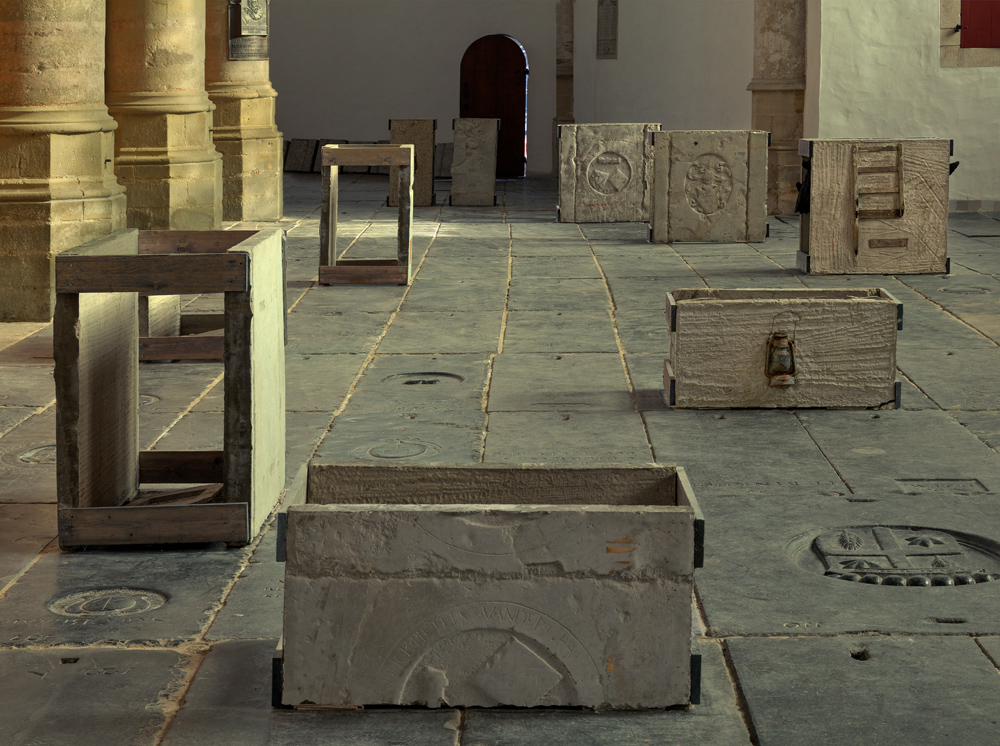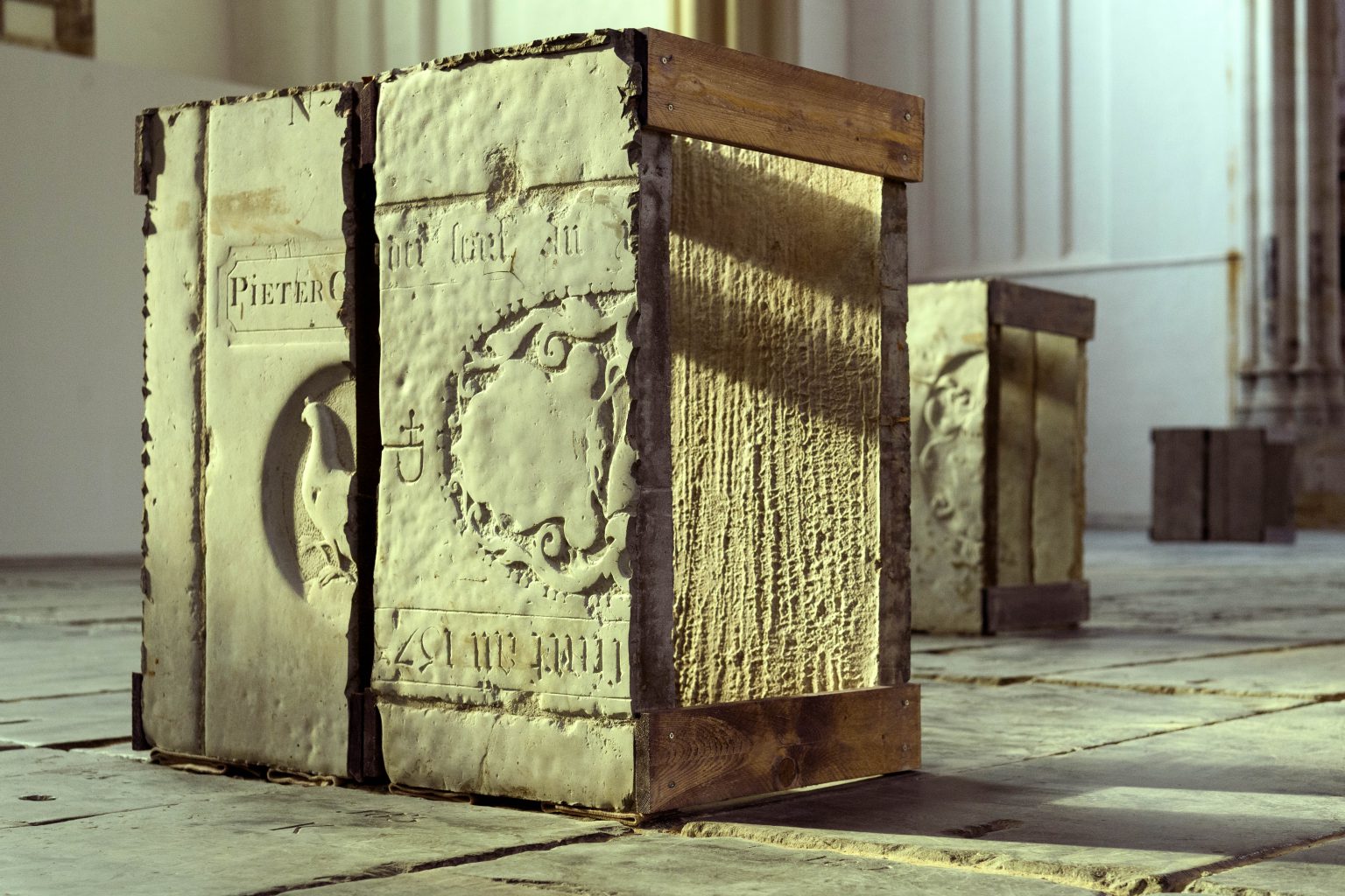 De vloer is hier van zerk: een bodem gevuld met schilders, biologen en schandalen die niemand zich nog wil herinneren, die we toch zullen moeten, omdat we moeten. Gezellig stuk weer, denk je. Maar ik kan er niks aan doen: de winter duurt te lang, er hangt hier een te precieze kou in de Oude Kerk, gevuld met werk van Ibrahim Mahama. Het slaat mij volslagen sereen om de oren met een gebroken geschiedenis, met de duisternis die achterbleef, die maar niet lijkt te mogen ontsnappen.