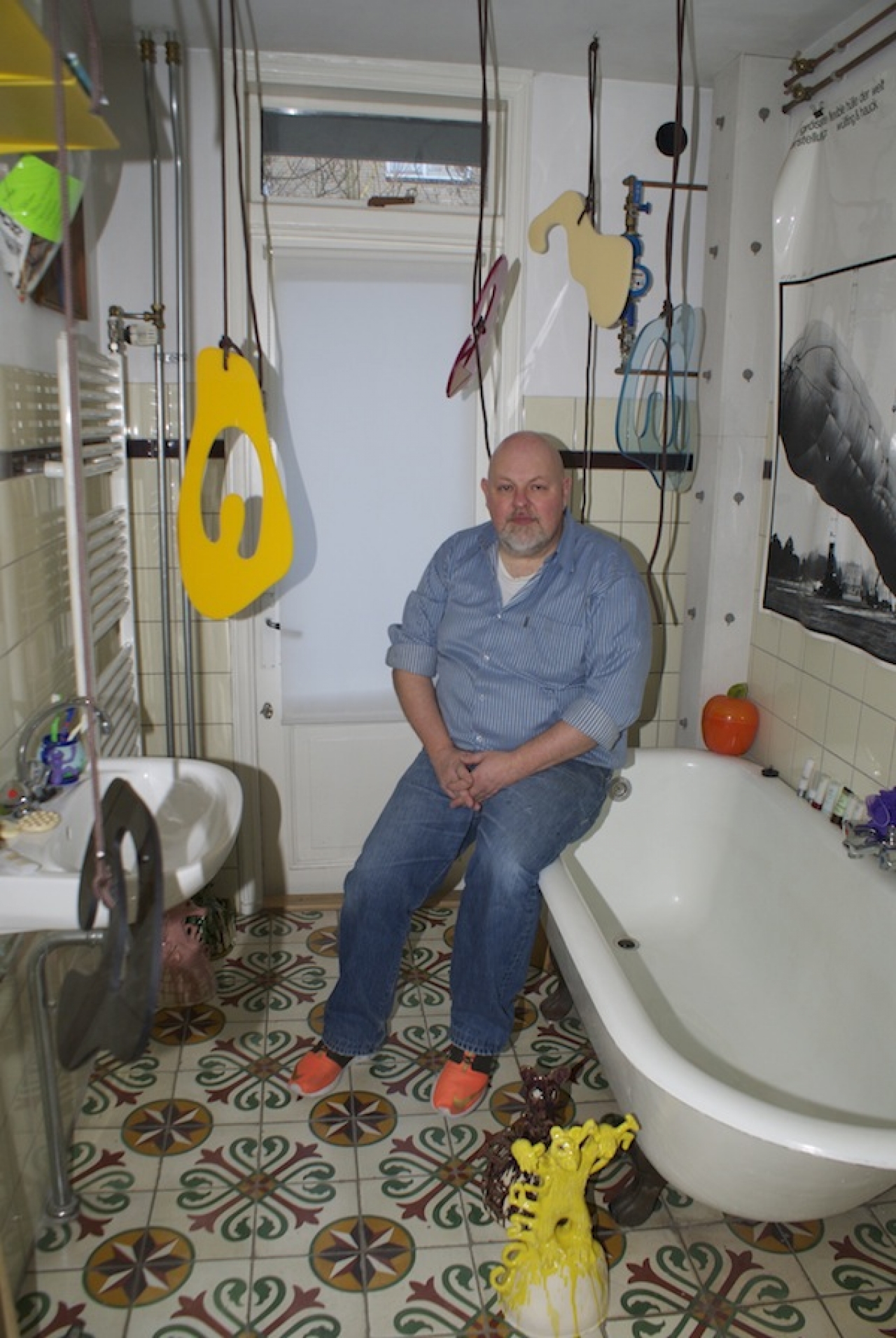 Frans Oomen woont in zo’n een typisch Amsterdams huis waar je direct na de voordeur via een smalle trap steil omhoog loopt en meteen begrijpt dat achter deze voordeur iets bijzonders aan de hand is. De muren hangen vol met briefjes, uitnodigingen, posters, druksels, foto’s, en in de smalle overloop staan de kunstwerken in bubbeltjes papier opgestapeld.