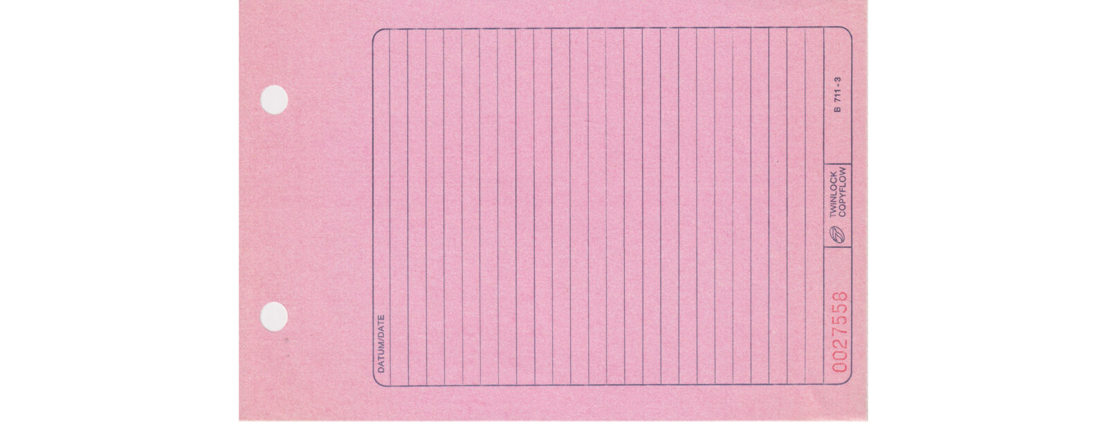 Ik zat met een witte en een gele samengepakt, als een drieling. Ze noemen dat geloof ik ‘doorslagvel’. Schreef je op het witte vel, dan drukte het handschrift direct door op de andere twee, daar zijn we voor gemaakt. Het is moeilijk, om nu losgemaakt te zijn. De anderen zijn op een andere plek. Dat is een gemis.