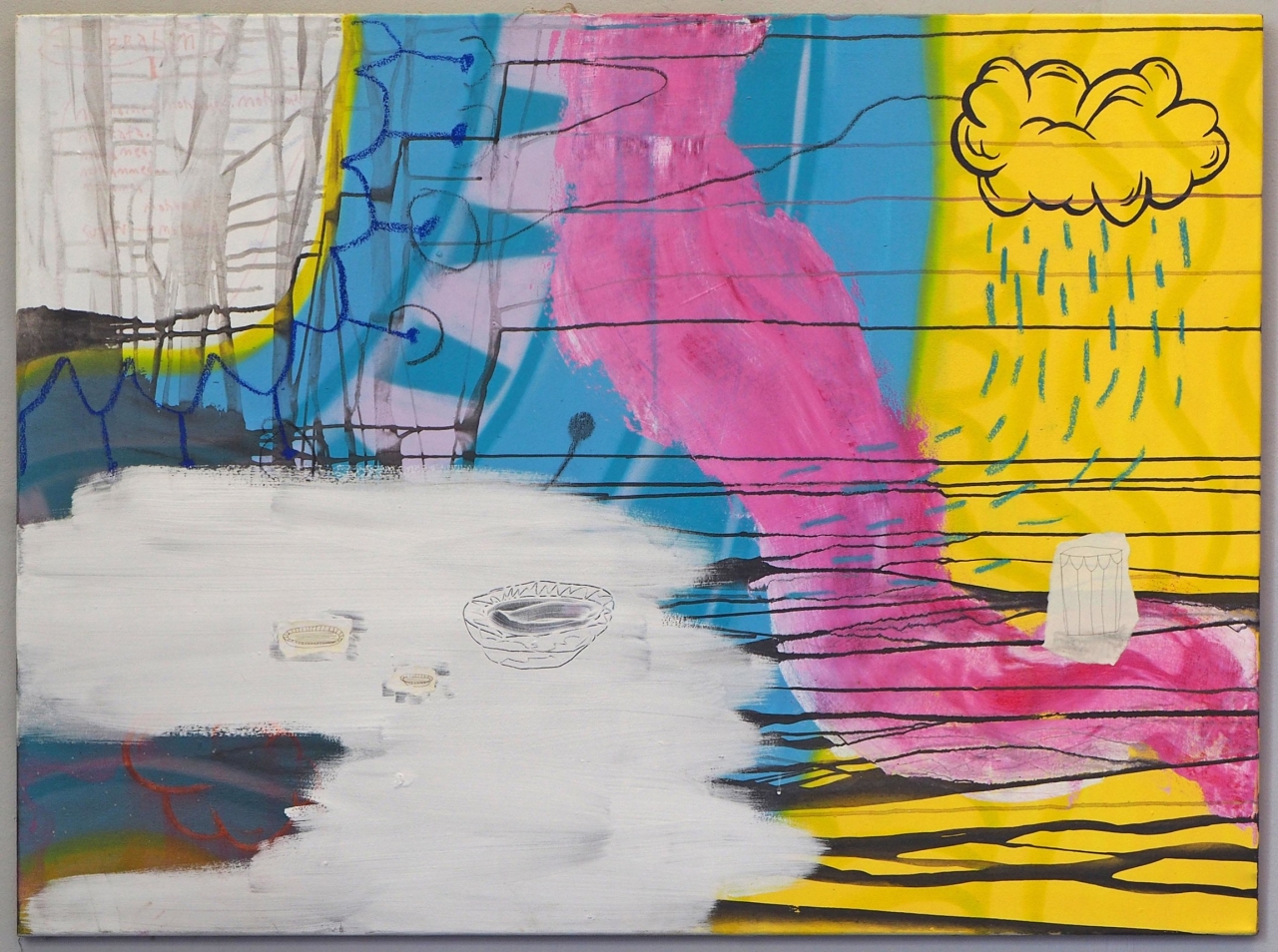 De studenten van de academies die geen eindexamententoonstellingen organiseerden hadden het zwaar, hoe konden zij nu hun werk bij Best of-curator Radek Vana onder ogen krijgen? Soms gebeurde dat door een toegewijde docent zoals Rein Jelle Terpstra die de taak als intermediair op zich nam bij Minerva Groningen en Matthijs Jeuring (ArtEZ, Enschede) had het geluk dat zijn werk was uitgekozen voor de expositie van de Koninklijke prijs voor de schilderkunst en daar werd opgepikt door Vana. Zijn Mid-City Garden toonde een feeëriek maar ook wrange stadstuin met proppen wc-papier als bloemen, als ik Edo Dijksterhuis in het Parool mag geloven. Ik had het zelf zo niet gezien, en ik zie ook steeltjes onder de witte vlekken maar die ambigue sfeer is precies de kracht van zijn tuin die door een waas van nachtlicht zichtbaar wordt. In zijn best wel onleesbare teksten kan ik iets van zijn visie ontdekken: hij wil ‘de wereld’ zijn vertrouwen geven ook al zou die wereld dat misschien niet waard zijn en hij hoopt dat zijn werken een diepere werkelijkheid weerspiegelen die alleen via het onbewuste naar boven kan komen.