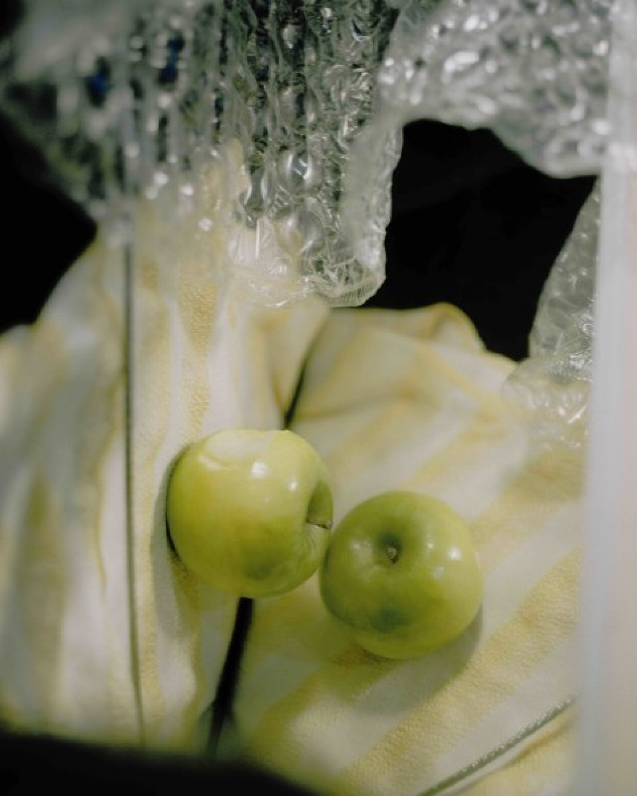 Ik heb geen idee waar fotografe Marta Capilla Urbano (Rietveld, Amsterdam) verbleef tijdens de lockdown maar ook haar foto’s zijn binnen de muren van haar waarschijnlijk kleine kamer gemaakt. Bubbeltjesfolie, kersen, knoflook, tape of zwart papier, met de simpelste spullen formeerde ze stillevens die laten zien hoe ieder de wereld ervaart vanuit zijn eigen perspectief. Een perspectief is immers niet meer dan het standpunt of gezichtspunt dat iemand kiest, al lijkt het soms even moeilijk om er afstand van te doen als van je eigen vel, dat perfect passende zakje dat je bij elkaar houdt. Haar werk is in al zijn abstractie een pleidooi voor een meer elastische wereld, een wereld waarin we kunnen vervellen als reptielen. Als we met iets meer afstand zouden kijken naar ons eigen blikveld op de wereld, zoals haar foto’s dat vastleggen, dan zouden we er wat van kunnen loskomen.