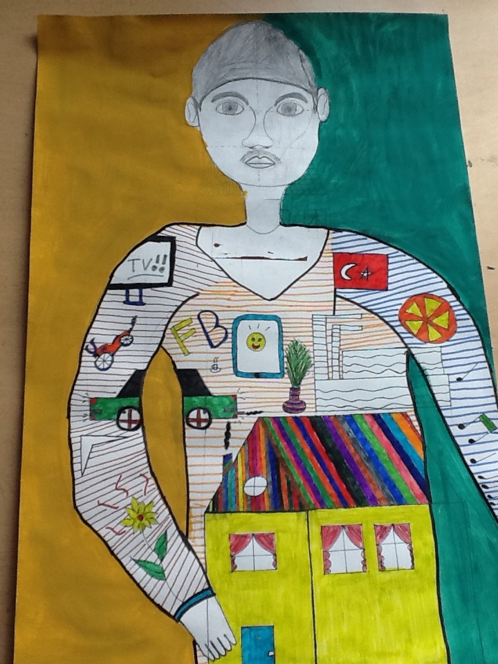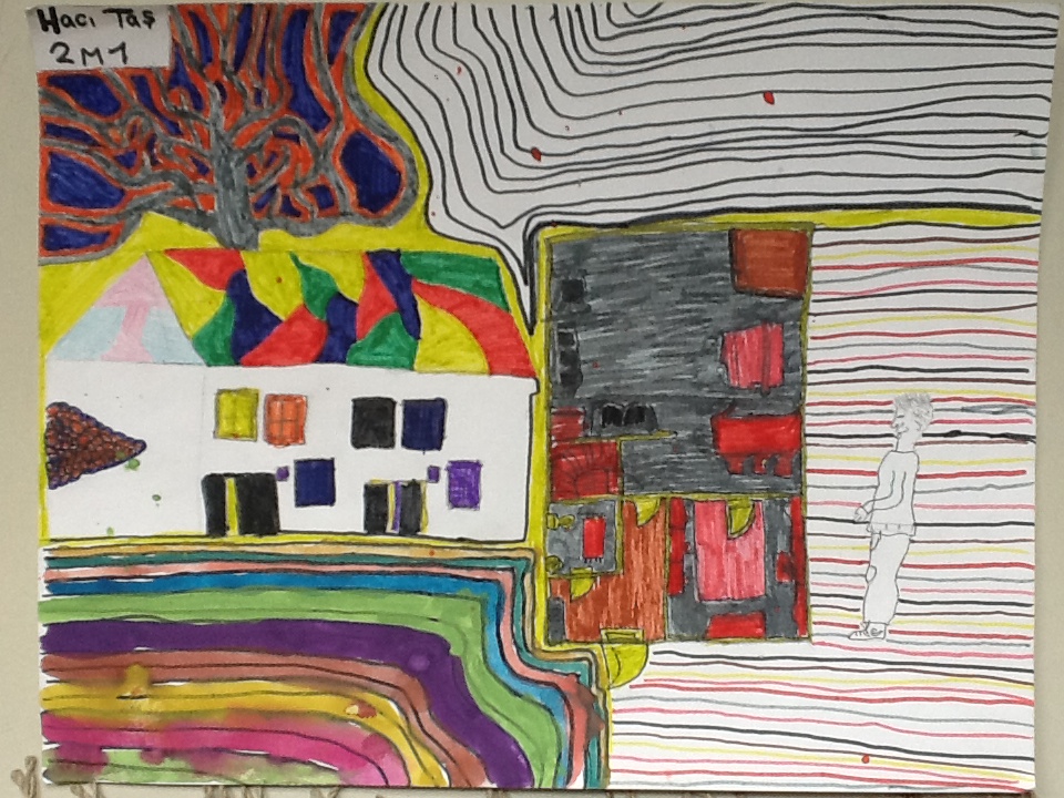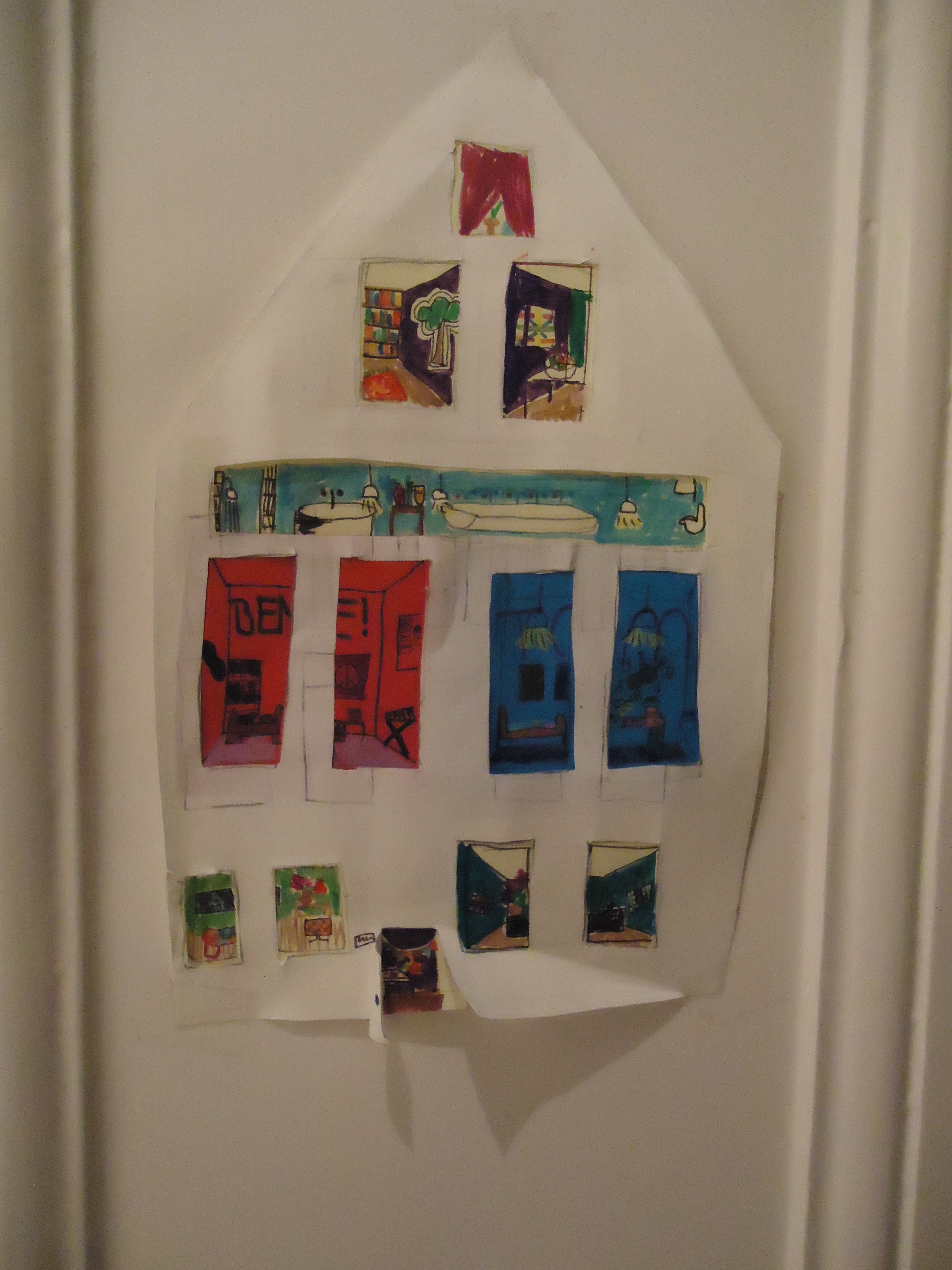 Huisjes zoals een kind ze tekent. Abstract gezien een mooie combinatie. Een rechthoek en een driehoek. Als kind kreeg ik van mijn moeder houten huisjes uit Oost Duitsland om mee te spelen. Je kon er hele mooie dorpjes en stadjes mee bouwen. Ik hield van het ordenen tot een overzichtelijke wereld. Precies tekende ik het zo. Mooie dorpjes met een kerk in het midden. Of dat je ook de binnenkant zag met een stoel, tafel met bloemen daar weer op. Ik houd van huizen. Hier woont een eenheid, gezin, familie. Van buiten heel gewoon, maar ellende kan zich binnenshuis voltrekken. De meeste verhalen uit mensenlevens gebeuren in deze huizen. In bed en aan de keukentafel kunnen hele veldslagen worden uitgevochten, maar we kunnen het hier ook weer goed maken. Hier moet je het samen redden. In mijn eigen werk laat ik zelf vaak ook een interieur zien. Een gezin aan tafel of man en vrouw in bed. Of soms een herinnering aan een gebeurtenis. In het Whitney Museum zag ik de huisjes van Lyonel Feininger. Hij maakte ze voor kinderen, mooie scupturaal gevormde huisjes en aandoenlijk zichtbaar versleten. Er is mee gespeeld. Hij maakte dit voor de kinderen van wie hij hield. Geborduurde huisjes, en de huizen in de Shaker giftdrawings staan ook voor goed leven.Voor zorgen voor elkaar en je kinderen. In bijna alle handwerk/ volkskunst is dat een thema. Een vrouwtje en een mannetje ernaast. En hoe verschillend ieder individu ook leeft in weze lijken al onze levens erg veel op elkaar vroeger en nu.