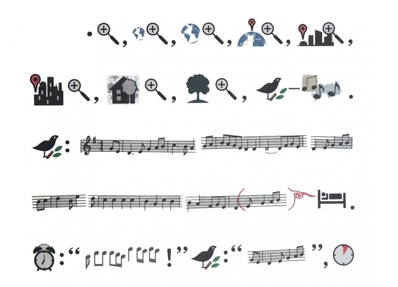 Dit is de eerste bladzijde uit het boek Book from the Ground van de Chinese kunstenaar Xu Bing, althans, dit is mijn tekstuele interpretatie. Het boek bestaat namelijk niet uit woorden, maar slechts uit pictogrammen, logo’s, illustratieve tekens en emoji. Symbolen die over de hele wereld gebruikt worden. Hiermee wordt een dag uit het leven van de normale kantoormedewerker meneer Zwart beschreven; hij staat op, eet zijn ontbijt, gaat naar werk, zoekt online naar een liefde en gaat op date.