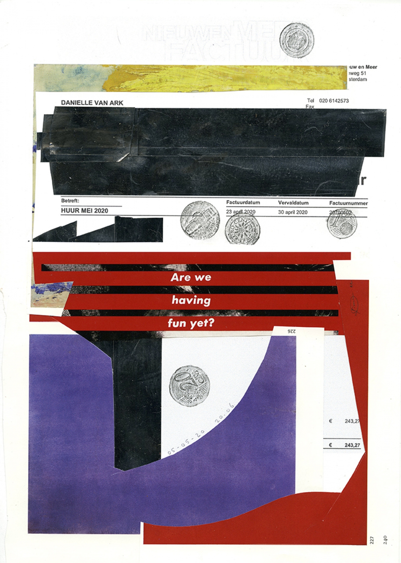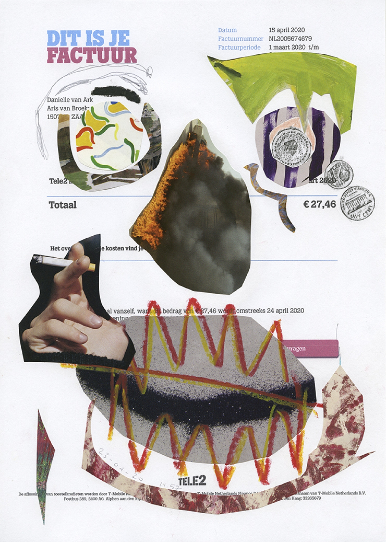 Voor veel kunstenaars stokt nu het inkomen, terwijl rekeningen binnen blijven komen. Multidisciplinair kunstenaar Danielle van Ark maakte naar aanleiding van de coronacrisis collages van haar rekeningen en verkoopt ze via Instagram: First come, first serve. De koper betaalt Danielle’s telefoon- of elektriciteitsrekening en kan in sommige gevallen voor slechts een paar tientjes een echte Van Ark aanschaffen. Ik spreek haar over de totstandkoming van dit nieuwe werk, de ongeschreven regels van de kunstwereld en over haar fascinatie voor materiaal dat mensen overleeft.