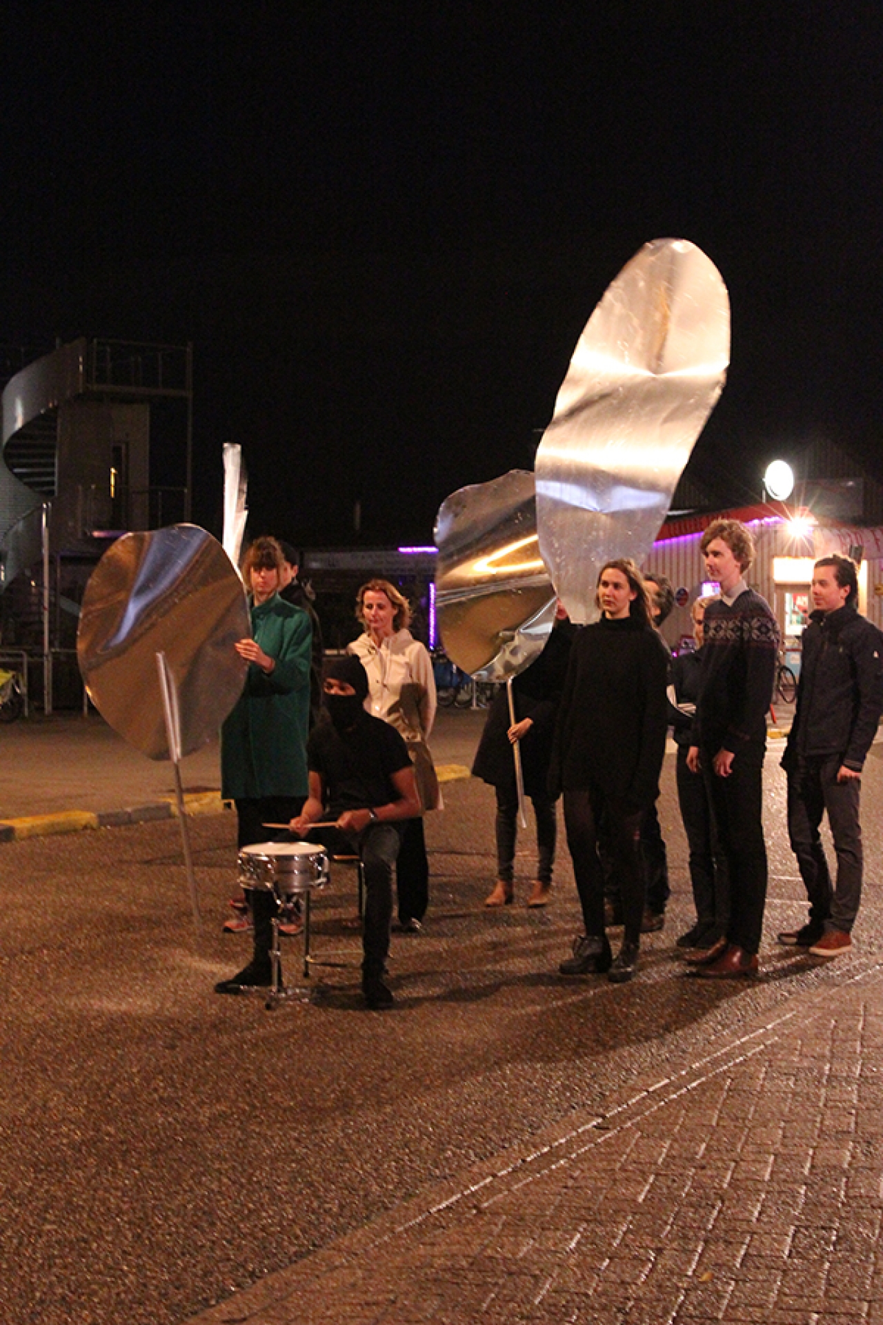 Het is half 10 ‘s avonds, de zon is ondergegaan; midden op straat zit een jongen met een klein fanfare drumstel, de weg blokkerend voor al het verkeer. Hij speelt een ritme op zijn trommel en wordt geschaduwd door een equipe jongeren met gigantisch grote bladeren van blik. Alsof de sultan wat koele lucht wordt toegewaaid door zijn bedienden, zo wordt deze trommelaar verlicht door de weerspiegeling van het avondlicht in het glanzende blik.