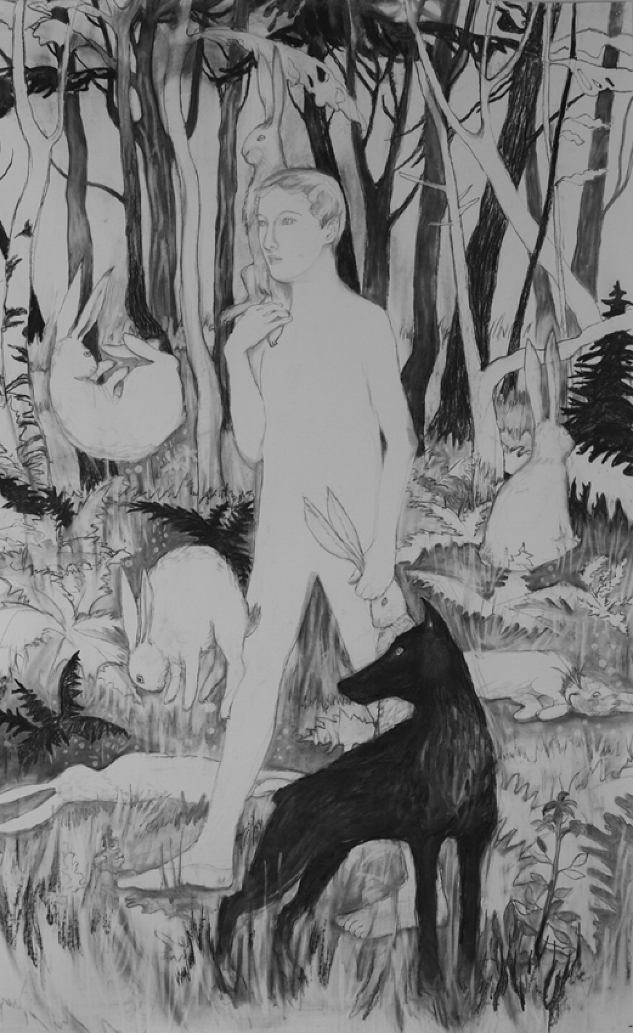 Het maken van een tekening is voor Nanette Kraaikamp die ook als danseres is opgeleid eigenlijk een pas de deux. Zij is de voorwaarde waarop de tekeningen in beweging komen. En iedere keer is het een dodendans, een danse macabre waarin zij figureert als het meisje en de tekening als de dood. We kijken naar de dood en het meisje, een thema in de kunst dat door Nanette Kraaikamp dusdanig wordt gepersonifieerd dat niet zij als kunstenaar de tekening tot leven wekt, maar dat de tekening haar als kunstenaar de doodskus wil geven. Daar rukt ze zich dan met iedere tekening uit los, uit die omhelzing moet ze zich tekenend bevrijden. Dat klinkt net zo pathetisch als de danskunst wel eens kan zijn, wat weer in volkomen tegenspraak is met de bijna ontnuchterende manier waarop Nanette Kraaikamp de tekenkunst beheerst. De macht die zij in haar tekeningen over het beeld dat ze schept uitoefent, maakt haar kunst uiterst kwetsbaar. Daardoor doen haar tekeningen zich escapistisch voor. Ze zijn bevangen door de aandrift op te lossen in de tijd. Nanette Kraaikamp geeft haar tekeningen de ruimte om ongrijpbaar, onaanraakbaar en gewichtloos te zijn. Kunst kent geen gewichtige massa, alleen waarachtige hoedanigheid.