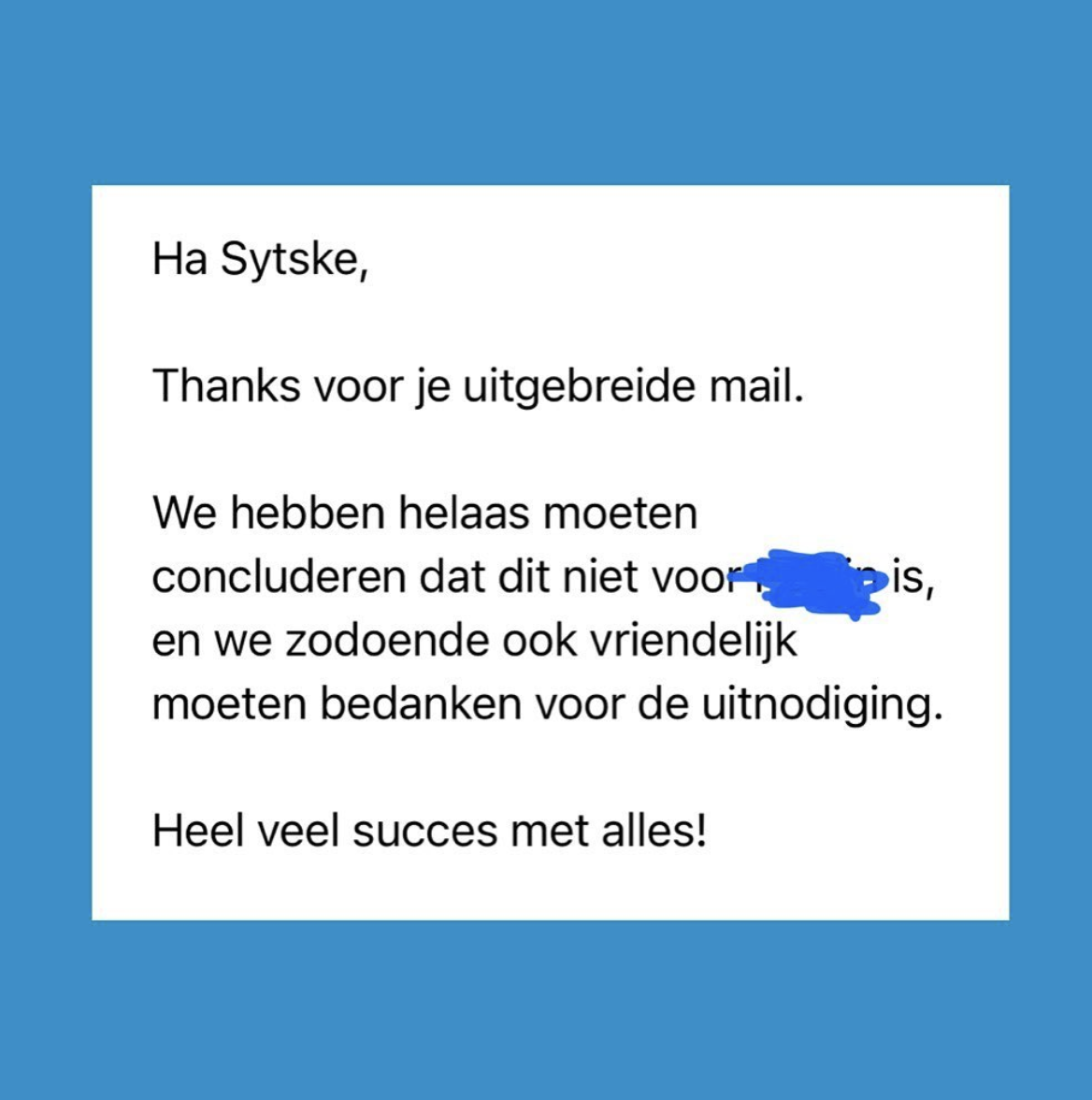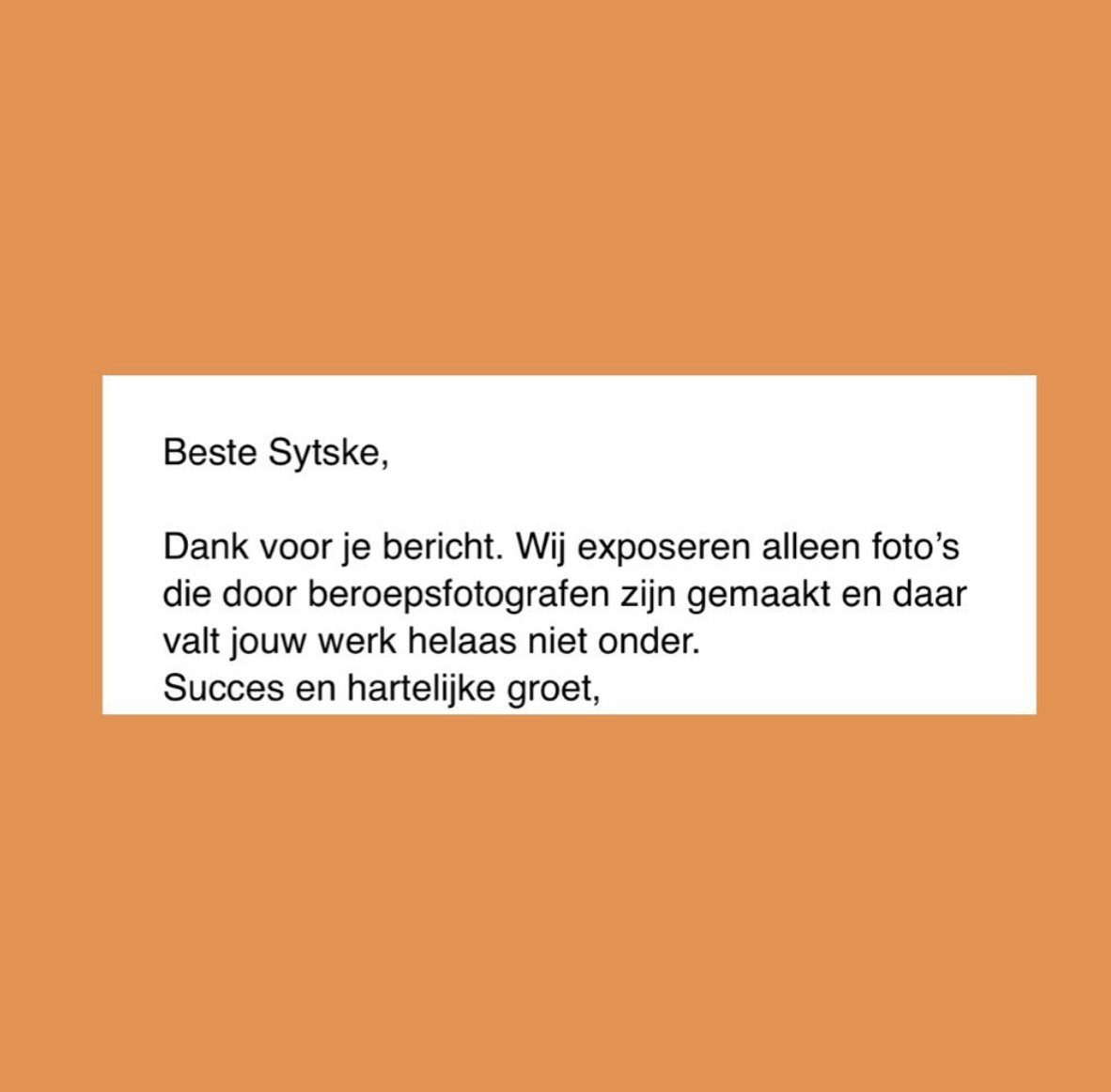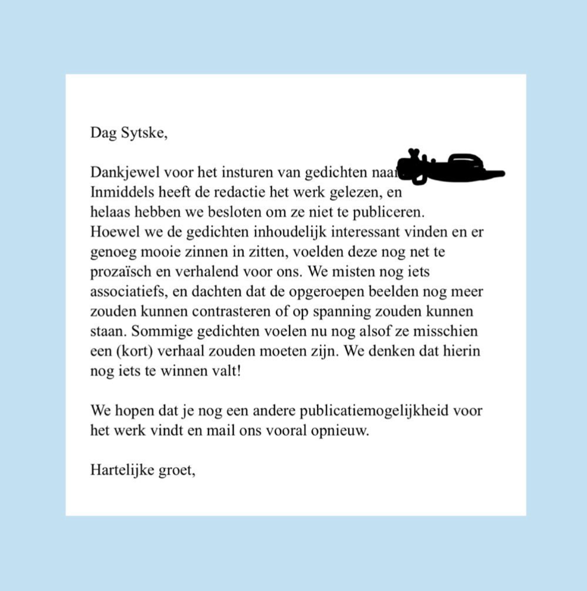 Een jaar geleden besloot Sytske van Koeveringe wekelijks met haar instagramvolgers een van de afwijzingen te delen die was binnengekomen als antwoord op haar inzendingen of aanvragen binnen haar beeldende en haar schrijvende werk. ‘Iedere maker kent het concept afwijzing. Bijna altijd eindigt zo’n gesprek met: ‘Het hoort erbij.’ Maar is het niet juist de bedoeling dat wanneer je beseft dat ‘dit erbij hoort’, je jezelf gaat afvragen of jij het er wel mee eens bent dat het zo gaat?’