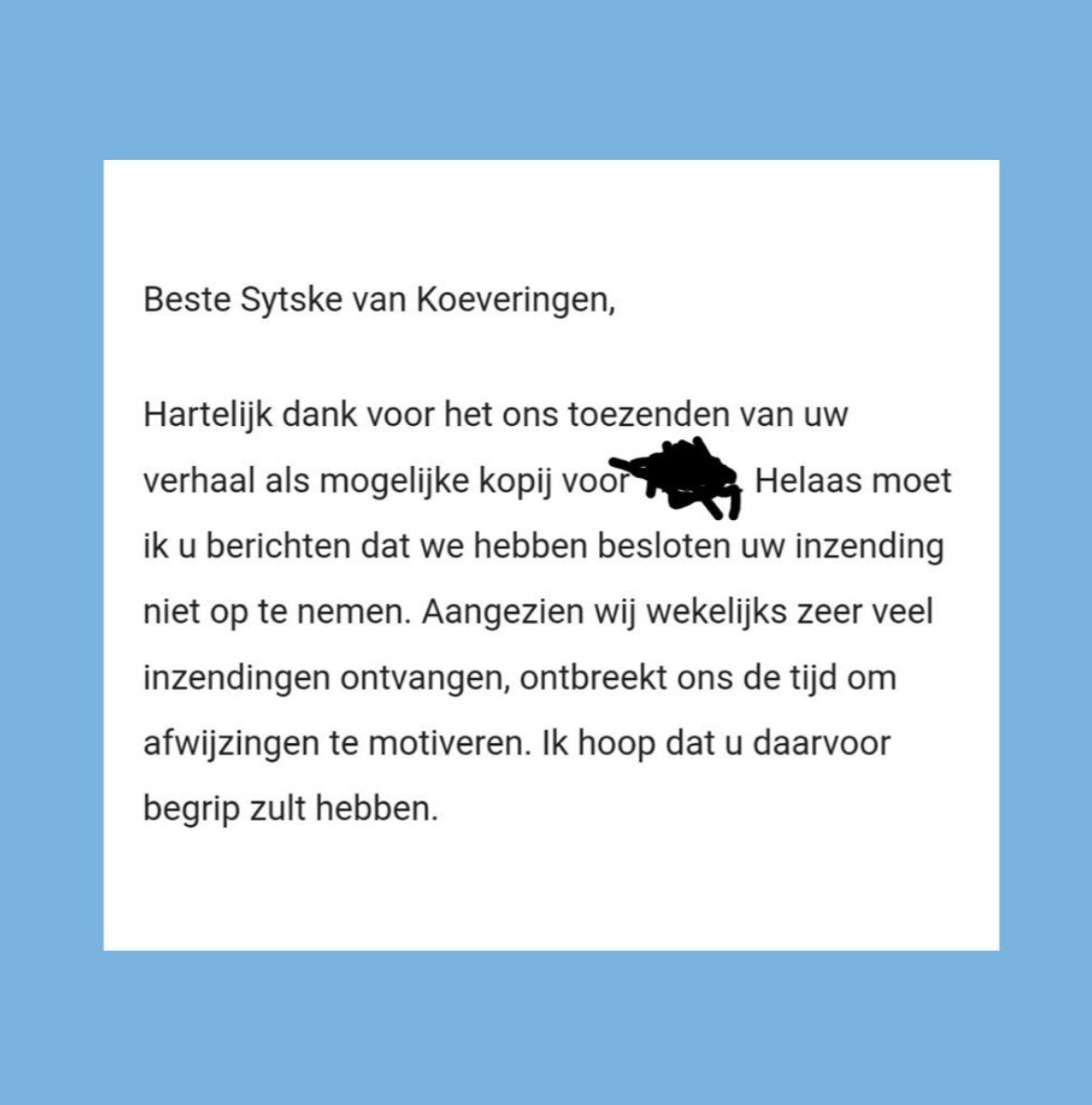 Omdat mijn stagiair in het laatste jaar van Creative writing op ArtEZ zit, heb ik via haar een selectie afwijzingen gestuurd naar haar klasgenoten.