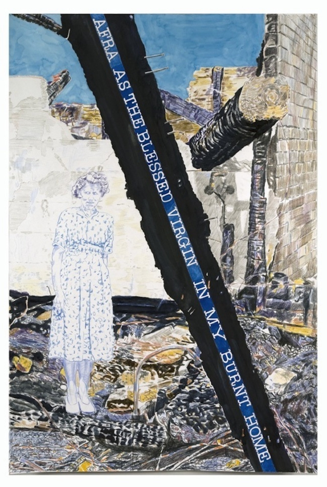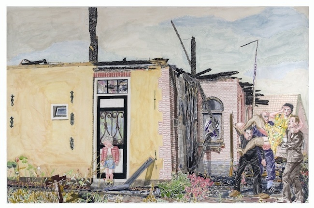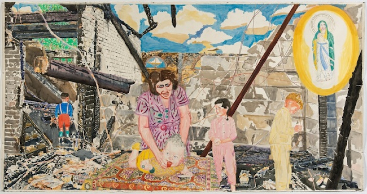 De boerderij staat in brand, rode vlammen, zwarte rookwolken, de koeien vallen dood neer maar op de voorgrond gaat het familieleven nog even rustig door. Vader laat zijn kinderen op een paard rijden en slaat trots zijn arm om de jongste zoon heen. Op een kleedje houdt de moeder haar vingers om de keel van de baby heen, zijn mond lacht vrolijk terwijl de speeltjes in zijn handje rinkelen. Het zusje in haar roze pyjama slaat haar handen ineen terwijl Pedro de handen kruist en bidt tot de heilige Maria. Op een andere tekening uit de serie bidt een naakte Pedro tot zijn moeder die temidden van de gegoede burgerij in de kerkbanken zit, die brave burgers die zo goed het onderscheid kunnen maken tussen goed en kwaad, waarbij ze zelf natuurlijk aan de goede Christelijke kant zitten.