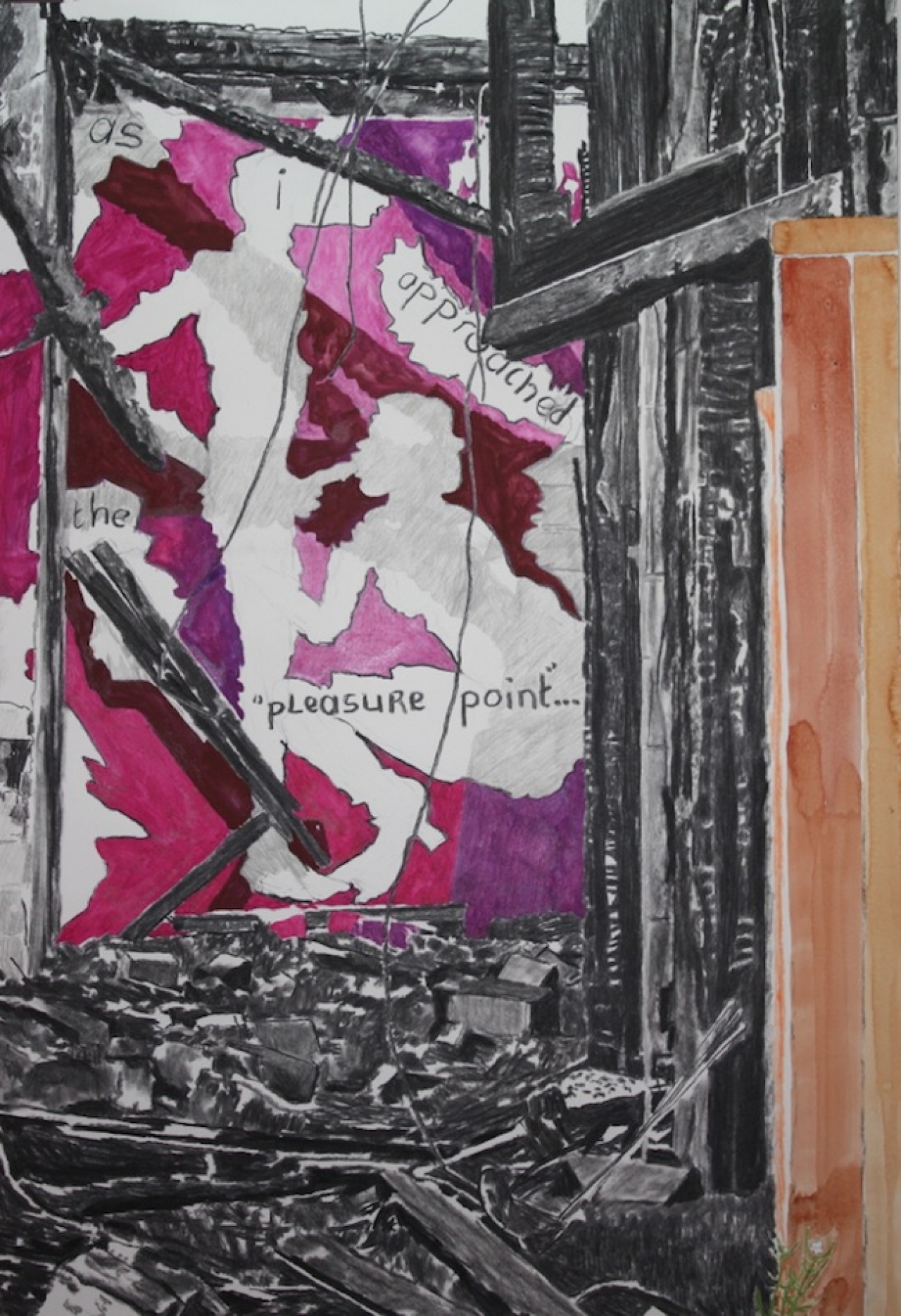 De zin in Burnt Home 3 ‘as I approached the pleasure point’ is een citaat uit het boek Guilty van Bataille. In die marge van ons blikveld bevindt zich het instinctieve bestaan, de lach, de nacht, de dood, het offer, de moord, de extase en de erotiek. In die marge bevindt zich ook het familie trauma. Bataille noemt dit soort ervaringen ‘heterogeen’, ongelijksoortig.