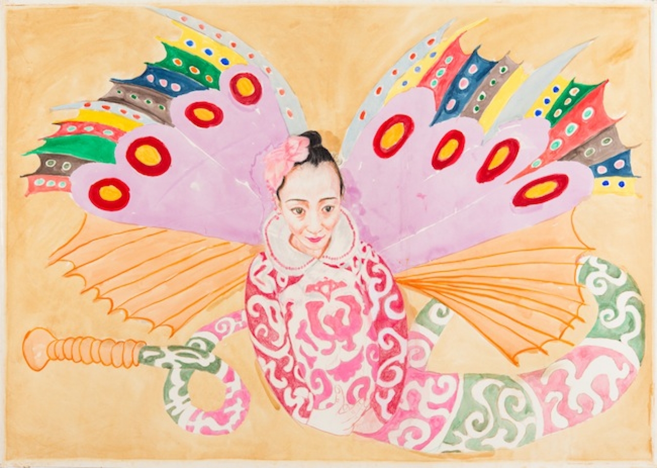 ‘In de hele serie L’éternel retour heb ik me vooral in de details door de figuratie van Henry Darger laten inspireren. Ik bewonder hoe Darger bloemen tekent, het zijn vreemde bloemen en dat vreemde had ik nodig voor die jurk.’ zegt Pedro Bakker.