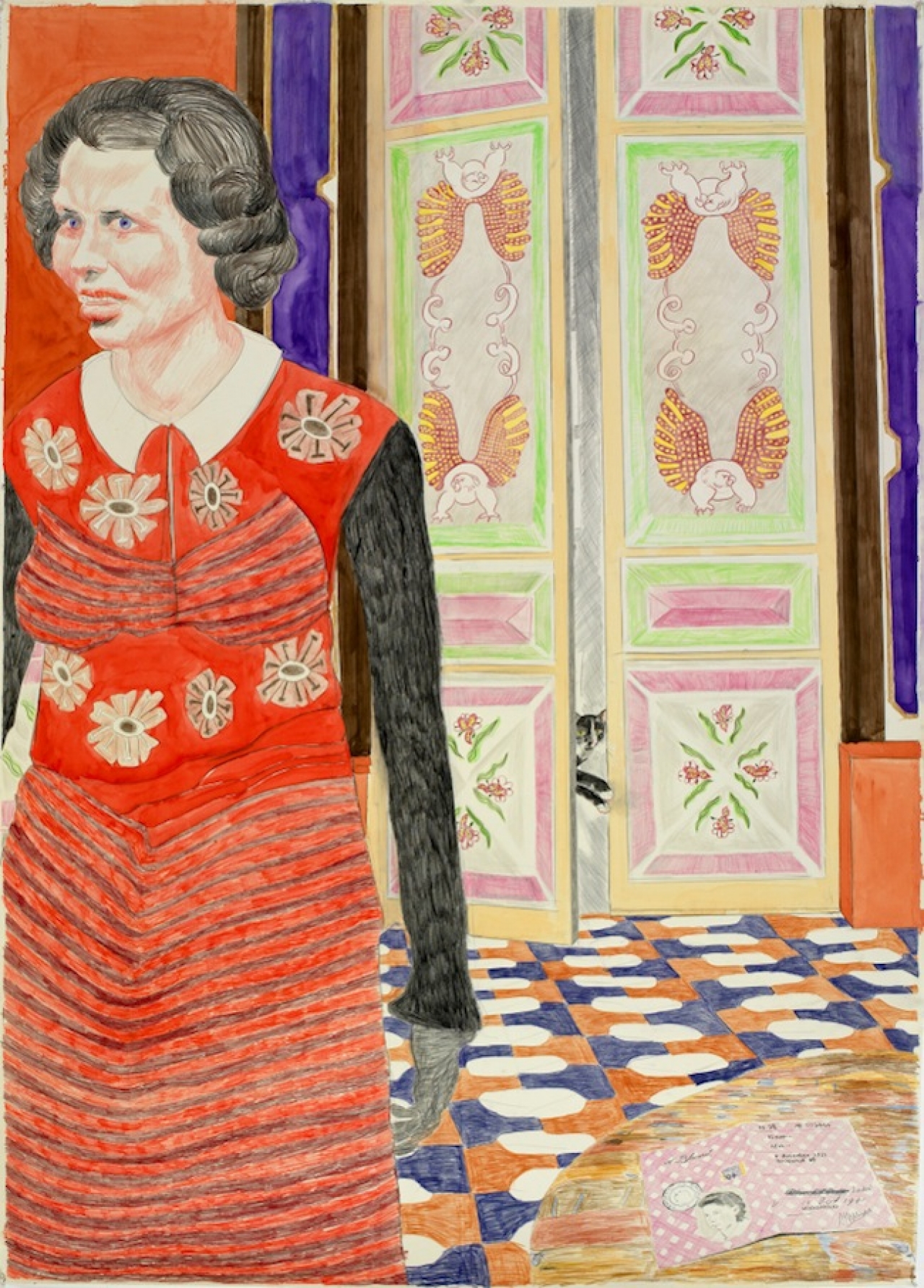 Aan de linkerkant, aan de rand van de tekening, staat een vrouw, het zwarte haar mooi gekruld, haar lange dunne zwarte arm met een grijze hand hangt naar beneden, ze draagt een rode jurk met decoratieve bloemen, heeft oplichtende blauwe ogen en een mond die vele uitdrukkingen tegelijk draagt. Ze verdwijnt bijna in de overvloed aan decoratie, zoals Gustave Klimt zijn vrouwen liet opgaan in de patronen op de achtergrond, vrouwen van gegoede stand, mooi maar ook leeg ondanks de volle patronen. Hier niet. Deze vrouw, haar ogen, haar mond. En precies daar stopt de beschrijving binnen alles wat zo helder is op de tekening. Misschien is er sprake van angst of huiver, blossen of schaamrood, verwezen.