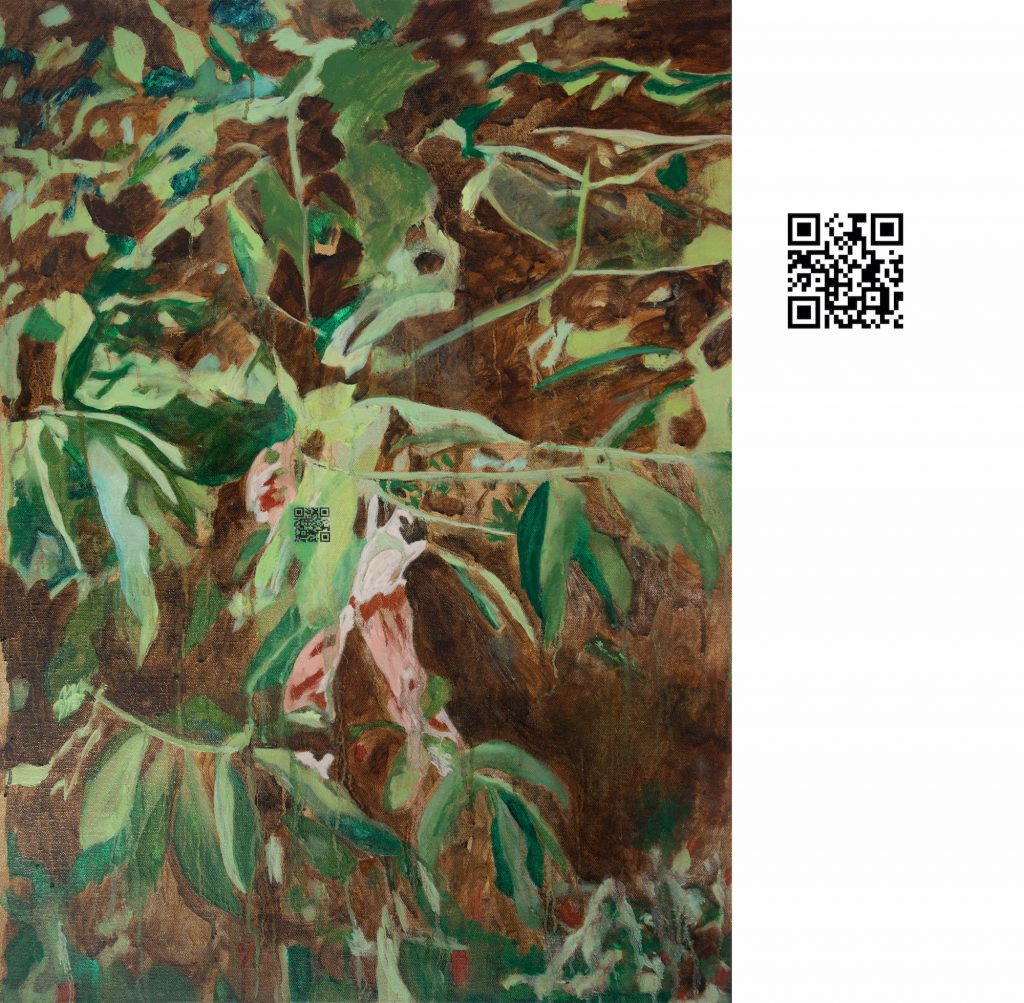 Door met andere mediums te experimenten wordt mijn praktijk gevoed en begrijp ik de risico’s en eigenschappen beter. Etsen heeft me bijvoorbeeld doen begrijpen hoe belangrijk sporen in mijn schilderijen zijn. Door een ets van een berg te maken ben ik gaan experimenteren met het digitale patroon en daarna heb ik fotoafdrukken gebruikt binnen mijn schilderij ‘Alps.’ Door tijdens de lockdown meer digitaal te werken kwam ik op het idee om een QR-code binnen mijn schilderij te plaatsen en het naar een vogellied te leiden.