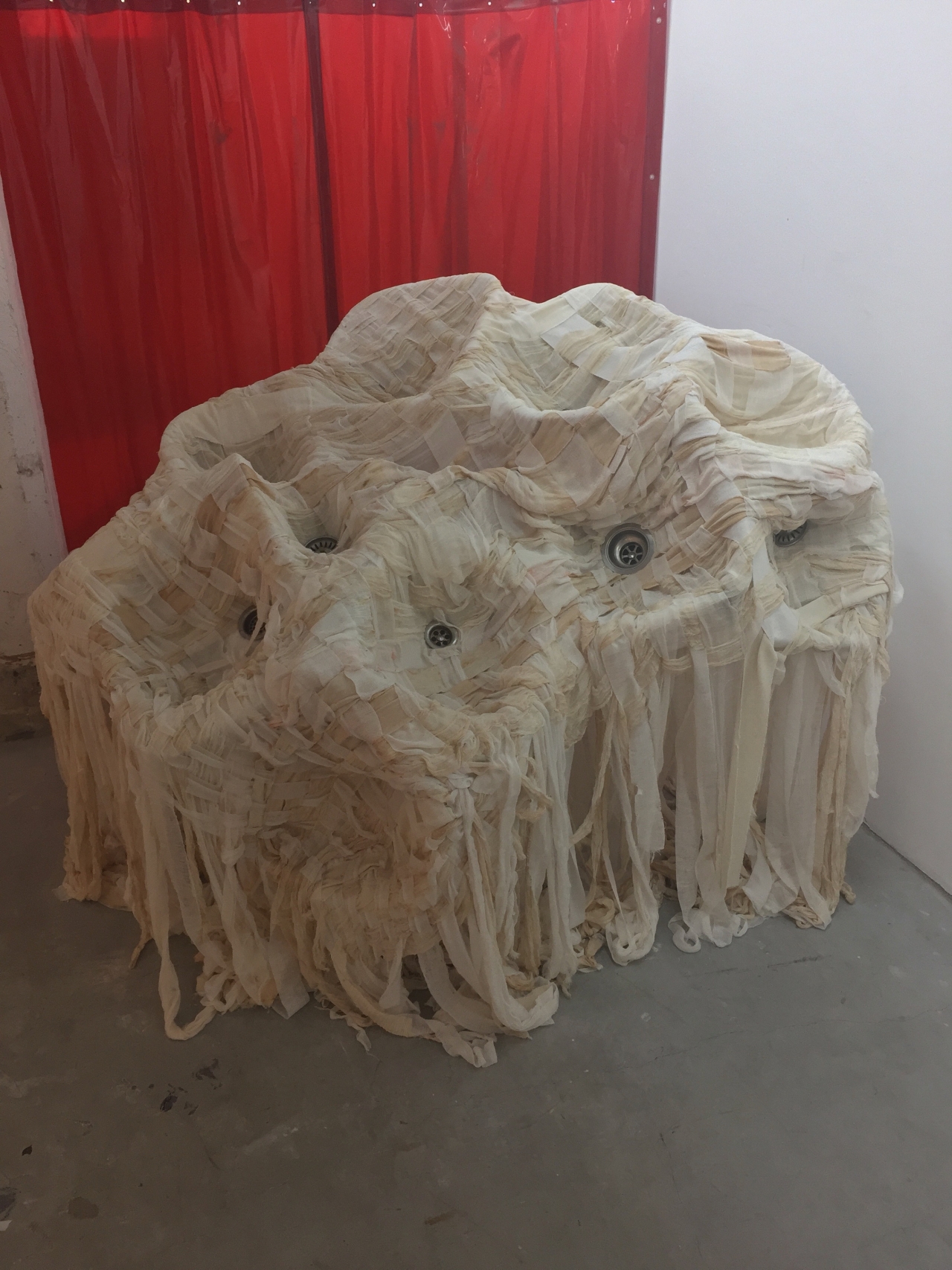 Een supermooi sculptuur van aan elkaar verbonden wasbakken bedekt met gevlochten stof. Onderdeel van een grote installatie van Hannah Joka.