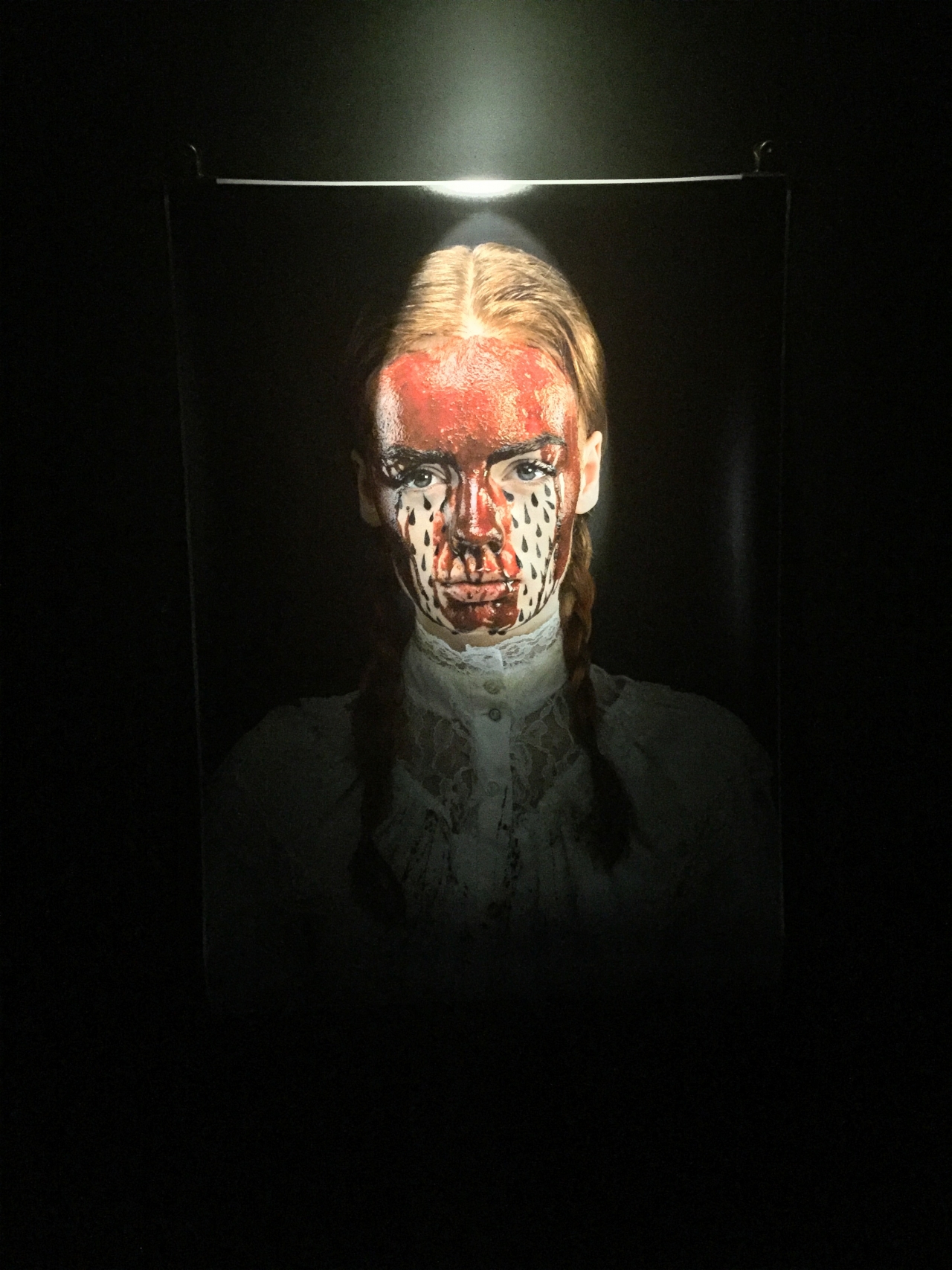 Een indringende foto van een met bloed en tranen beschilderde vrouw in een victoriaanse blouse, tentoongesteld in een donkere ruimte met video en klokken-installatie van Iris Zendman.