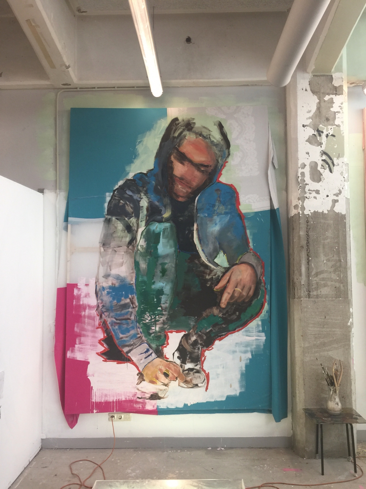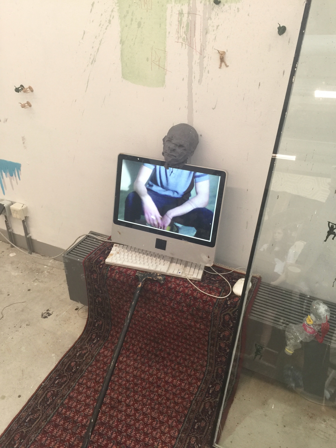 Schilders zijn er ook op de AKI, er is een Fine Art Painting richting, zoals ik in de catalogus las, maar ik zag bijvoorbeeld ook grote schilderijen in een installatie van Joris Strouken die dan weer afstudeert bij Fine Art Sculpture. Zijn schilderijen zijn heel groot en hier en daar onaf, of zo lijkt het, met vlugge onderdelen en met veel zorgvuldigheid geschilderde delen. Allemaal in samenhang met losse lappen, kastjes, soldaatjes en een computer met stilstaand zelfportret en gekleid hoofd, wat ik een mooi ding vind.