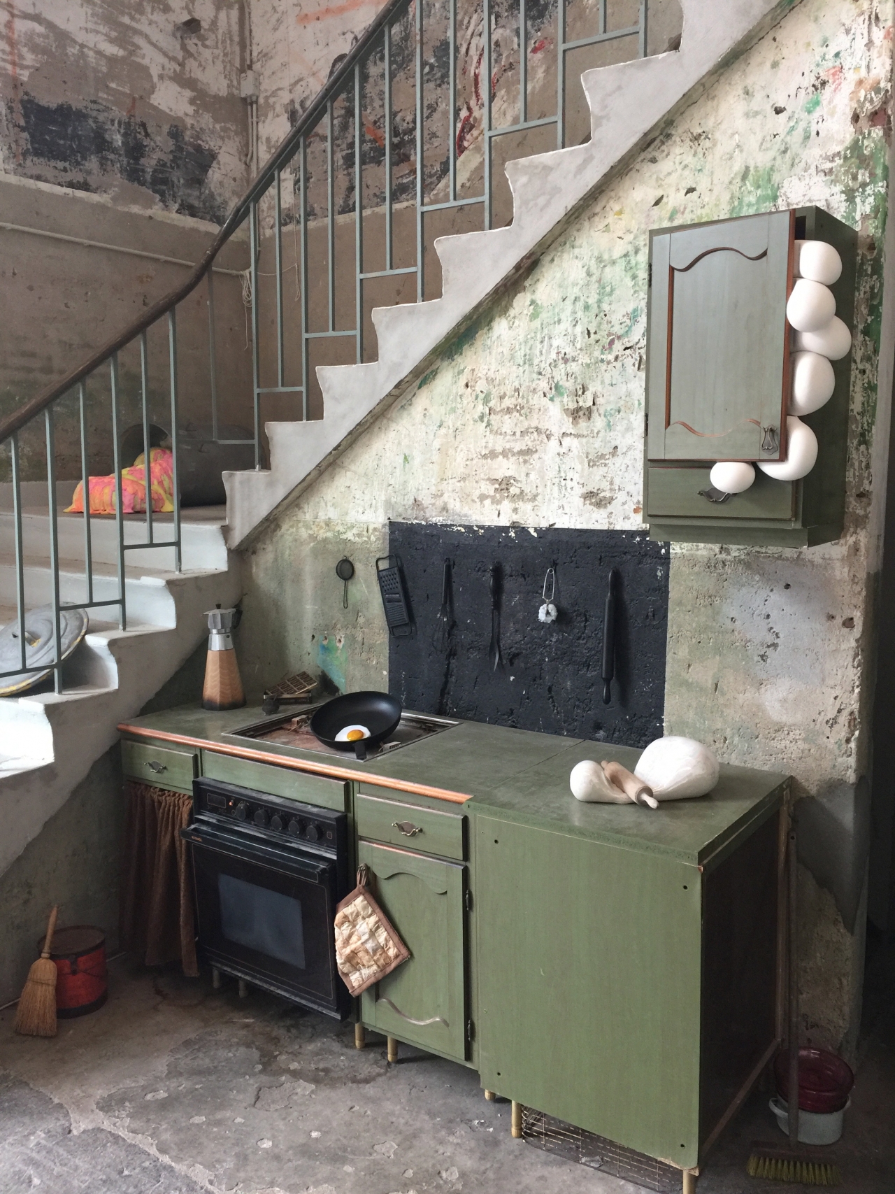 De installatie van Kira Fröse is een opstelling van een oude groene keuken in een trapgat op de begane grond. In deze keuken zijn allerlei voorwerpen te zien die een bepaalde tactiliteit in zich hebben en zich bezighouden met typische beeldhouwersvragen over vorm, kleur, structuur en materiaal. Bobbels die uit de kast komen zijn van gips en dus hard en stoffig, de uitstulping uit de lade is zachtgroen en van schuimrubber. Allemaal sculpturen met veel gevoel en zorgvuldigheid gemaakt. Soms in contrast met een roestige kraan of een stapel vieze, zwarte sponsen. Ik vind dit een interessante opstelling die je tegelijkertijd aantrekt en afstoot, een installatie die je een beetje in de war brengt. Deze verwarring begint al als je de trap af loopt en de geur van koffie je tegemoet komt. Helaas niet de geur van koffie zoals ik die lekker vind, puur en sterk, maar aangelengd met een of andere Unilever karamelsaus. Deze dubbele geur heeft Kira ook laten ontwerpen en wordt door een geurmachine verspreidt. Vanaf 1 juli is werk van haar te zien in Nouvelles Images in Den Haag.
