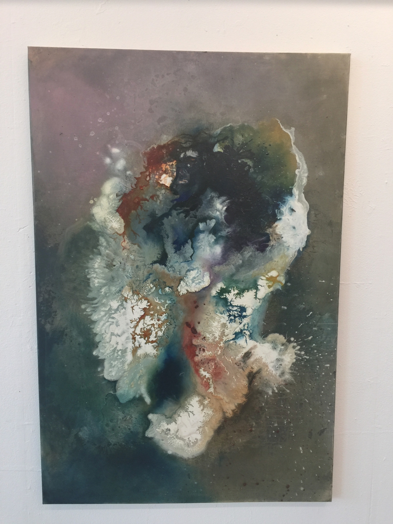 Een andere schilder die mij opviel is Kirsten Everink die organische schilderijen maakt met allerlei in- en uitzoom-momenten. Zoekend naar licht-donker, diepte, vorm en kleur in het proces zelf. Allerlei momenten die associaties oproepen met figuren en landschappen, soms doorkruist met geometrische vormen. Dit werk voelt op een bepaalde manier niet hedendaags maar eerder tijdloos. Zelf ben ik er nog niet uit welke van deze twee de betere is. Moet kunst hedendaags zijn: hip, happening, modieus en vergankelijk? Of moet het juist tijdloos zijn: klassiek, universeel en eeuwig houdbaar? Het doet me een beetje denken aan Wout van Heusden, een schilder die in de jaren zeventig schilderijen heeft gemaakt die nog steeds hedendaags aanvoelen.