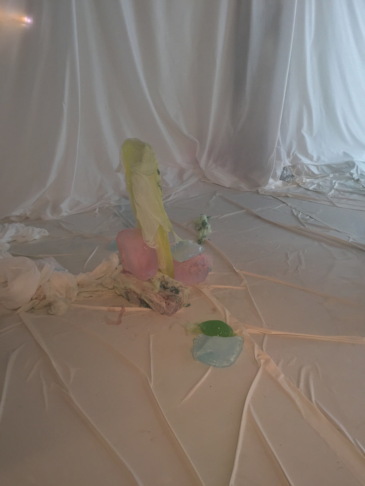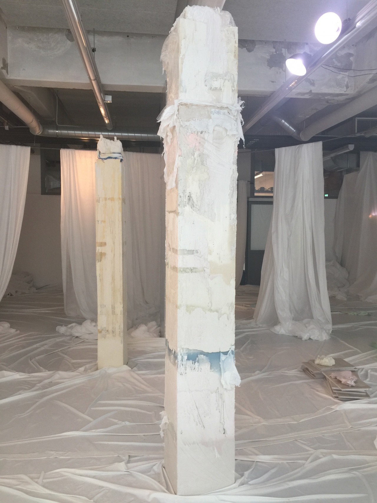 Een andere ruimtevullende installatie van Kristel Geerts is er ook één die zijn oorsprong vindt in materialiteit. In de grote ruimte hangen rondom witte gordijnen en ligt op de grond wit zeil. In deze ruimte bevinden zich grote gekleurde blokken ijs die langzaam smelten. Het water met de kleurstof trekt in de gordijnen waardoor de ruimte heel langzaam van kleur verandert. Een soort minimalistische James Turrell. In de ruimte staan twee zuilen gemaakt van gips, parafine en pigment, die ook langzaam van kleur veranderen. Deze zuilen hebben, net als het werk van Kira, een heel mooie maar volledig ander gevoel voor en gebruik van materiaal. Op mijn foto’s is helaas niet goed te zien wat ik omschrijf.