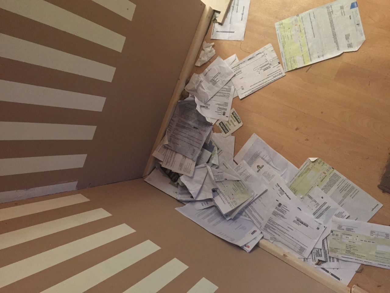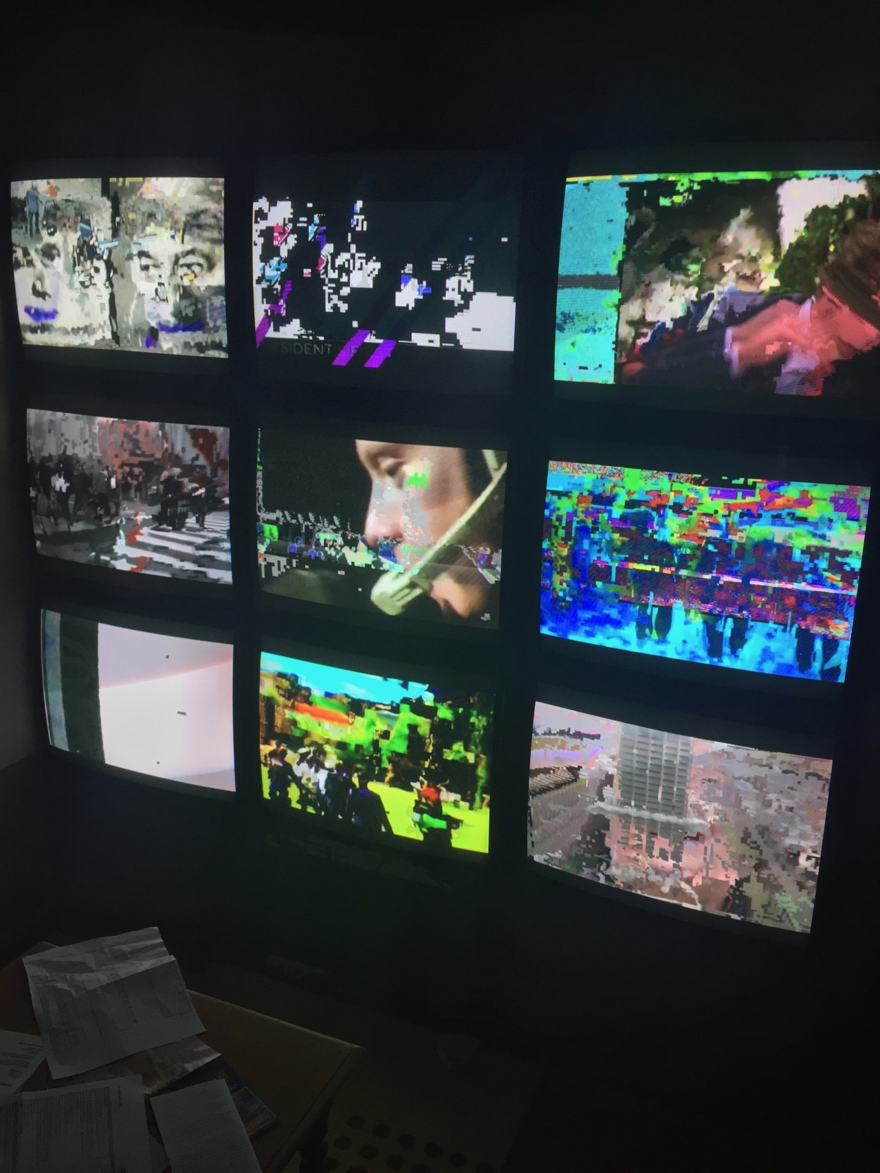 Een installatie van Terence Baier waar in een hokje bezaaid met acceptgiro’s op een negental monitoren allerlei glitchvideo’s getoond worden.