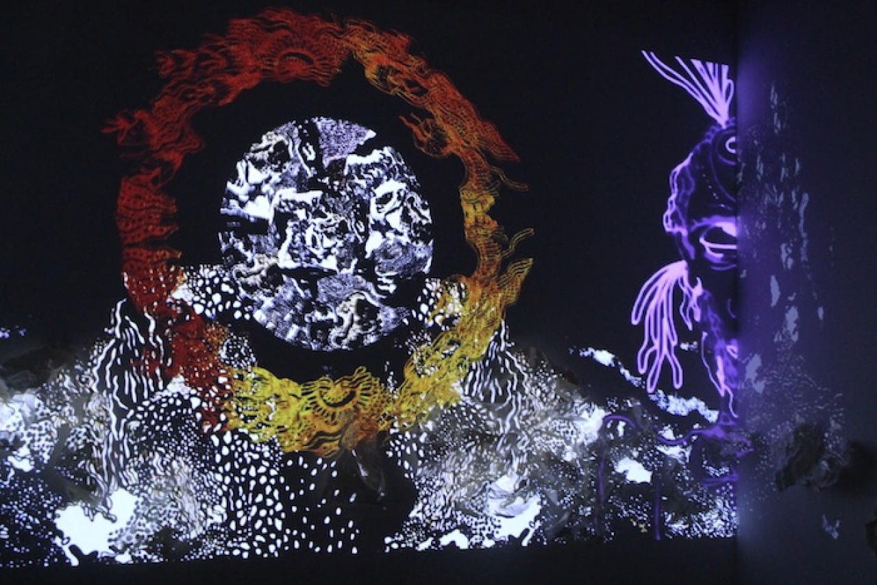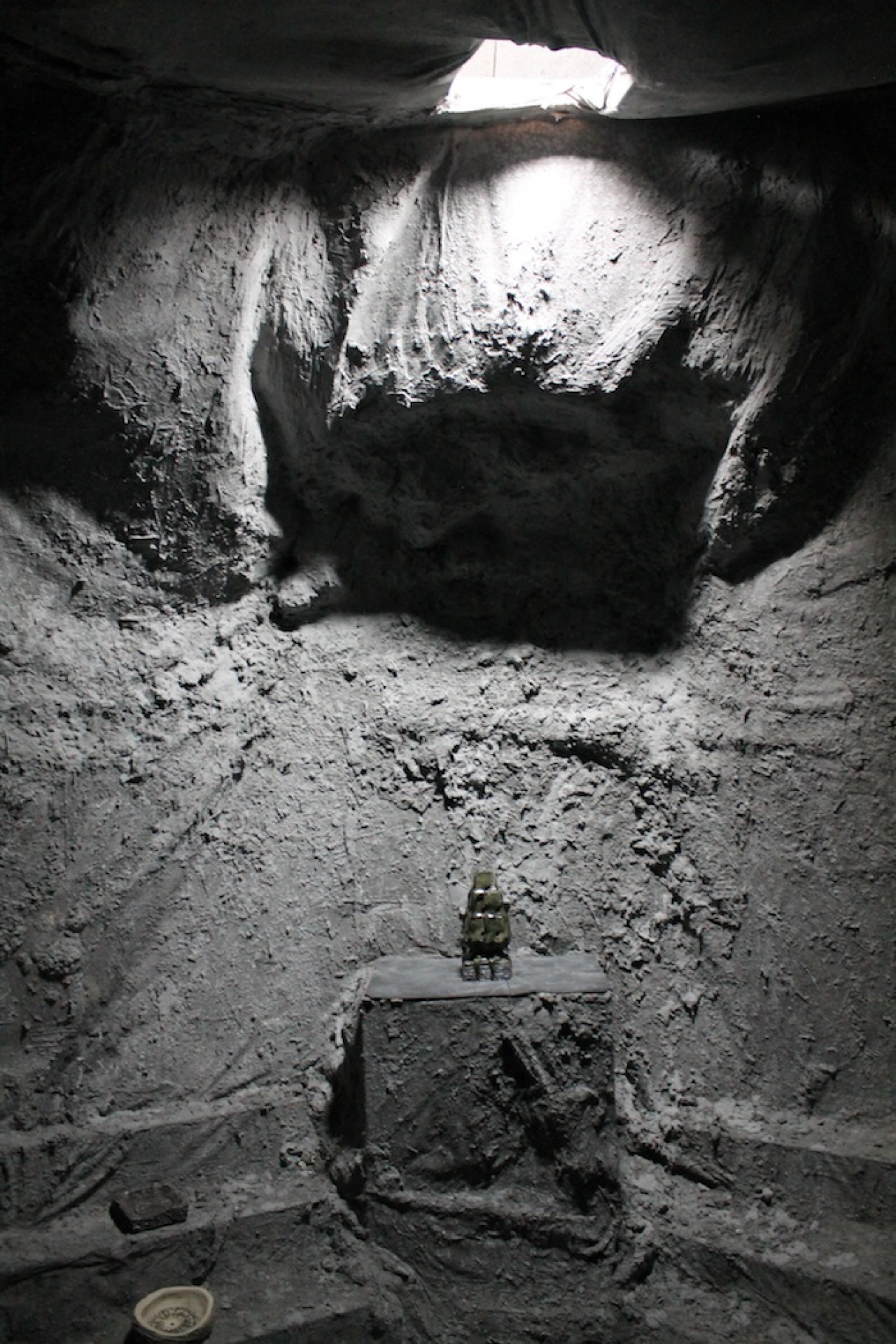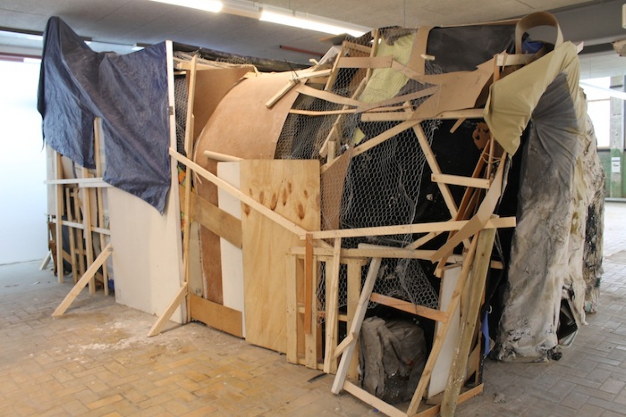Christopher Bohlen bouwde een soort grot, onderkomen, hut. Op de muur bij binnenkomst en op de vloer zijn tekens te vinden. Een schrift dat hij zelf ontwikkelde en dat het idee van het betreden van een bepaalde cultuur versterkt. Binnen zijn er meer overblijfselen van deze cultuur te vinden. Lachen noemt Bohlen noemt de buitenkant typische AKI trash. De buitenkant is echt dienend aan de binnenkant.