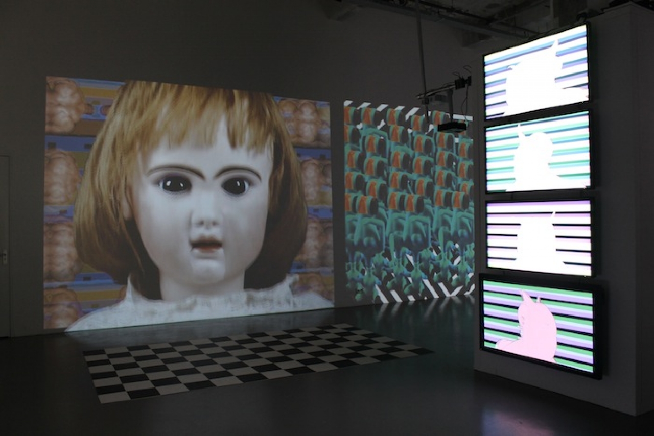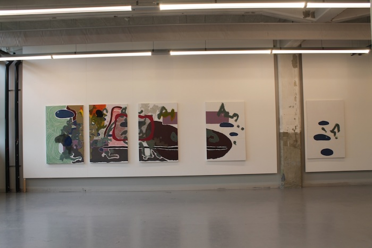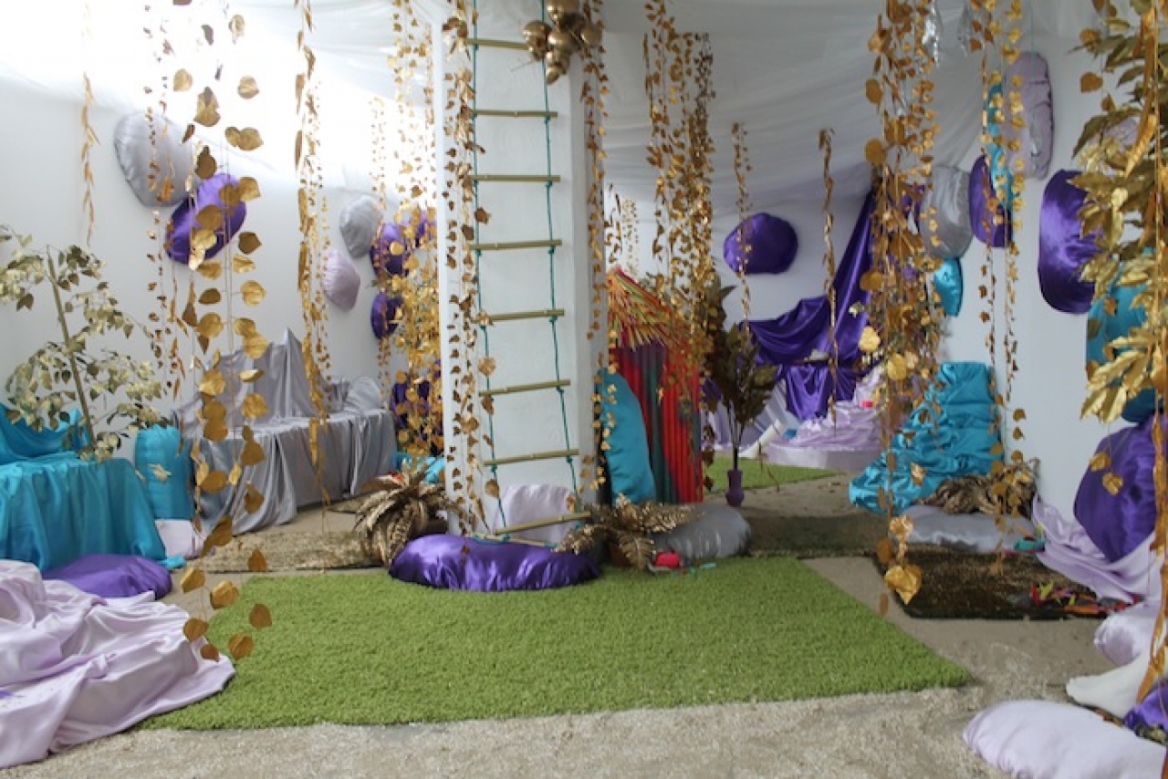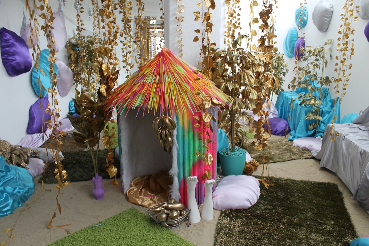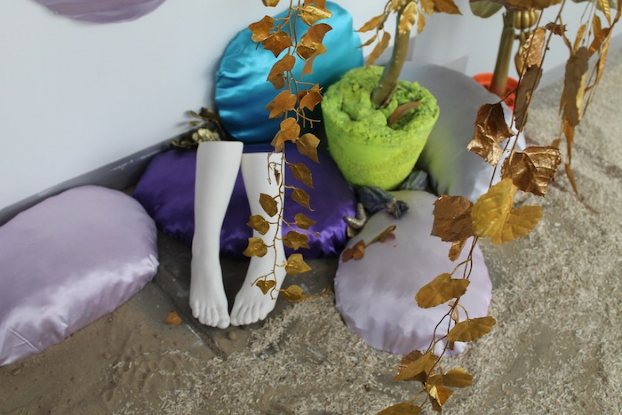 De kleurrijke installatie van Bibi Spaans mag je betreden met fluffy sloffen. Mensachtige figuren zonder armen, met bolle buik, kleine mensbeeldjes van brons, bollen met poppenbeentjes en een muur met vele schetsen. Een, niet zo serieus en vrolijk werk waarvan je gaat glimlachen.