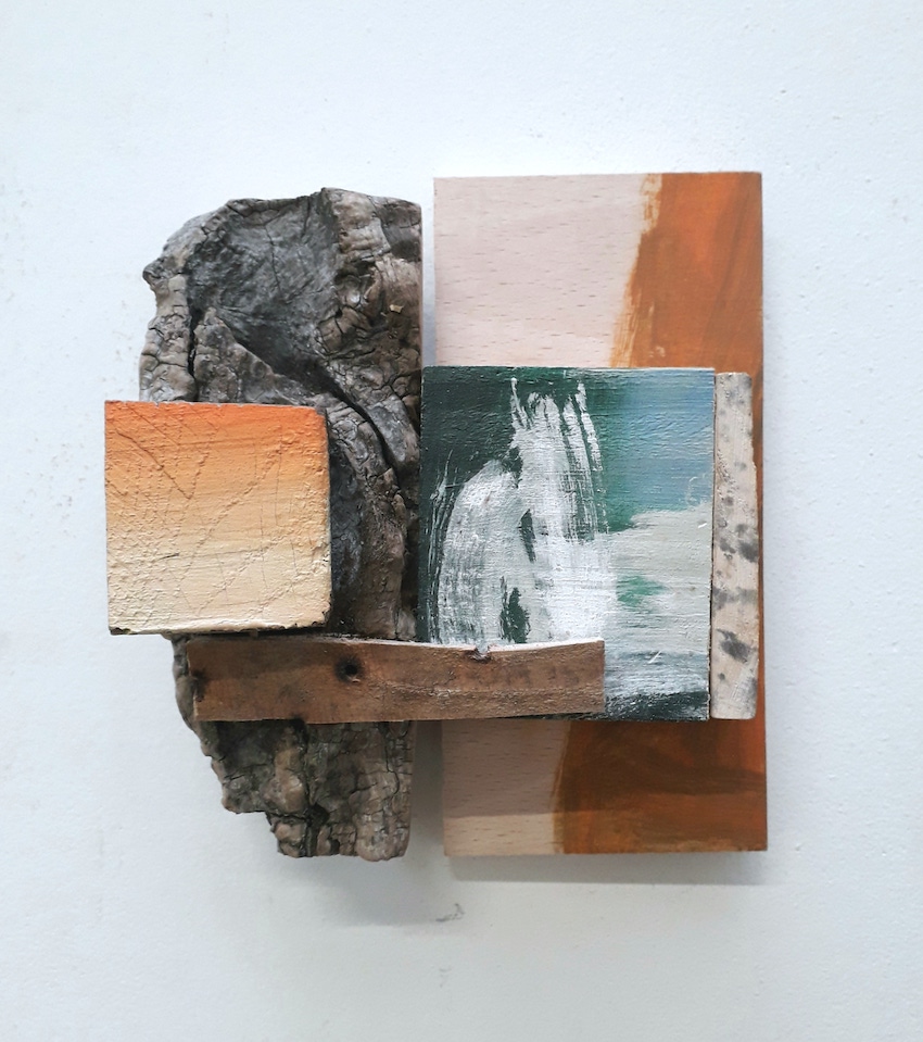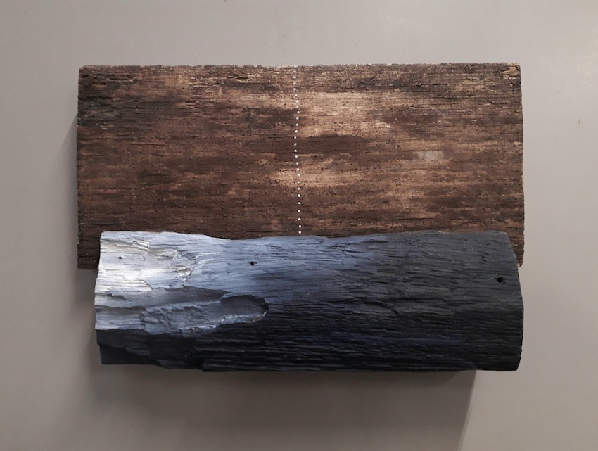 Fred Geven ontdekt iets in hout dat hij met zijn persoonlijke leven kan verbinden. In de nerven van een plank ziet hij de loop van de Dommel die hij met blauwe verf weergeeft. In een scheef afgezaagde tak ontdekt hij een Ierse baai waar water tegen het aflopende land klotst. In de jaarringen van een stammetje herkent hij de kringen in het water als je er een steen in gooit. Uit een ontschorste ent druipt een zwarte druppel als verbeelding van het verlies van zijn overleden zus. Twee gekruiste verschillende stukjes hout vormen samen met een paar beschilderde damstenen een vliegtuigje dat zijn verlangen als kind naar vrijheid uitdrukt. Door twee verschillende plankjes boven elkaar te monteren maakt hij een verrassend overtuigend landschap.