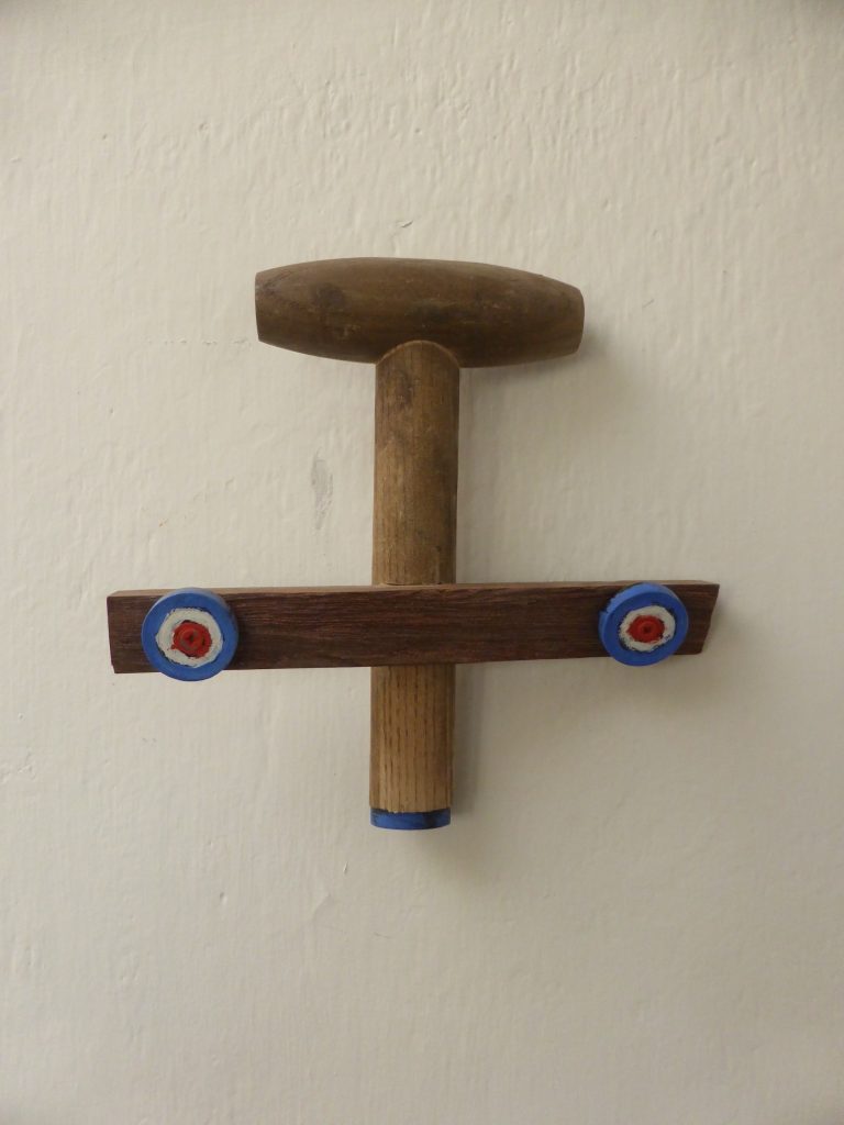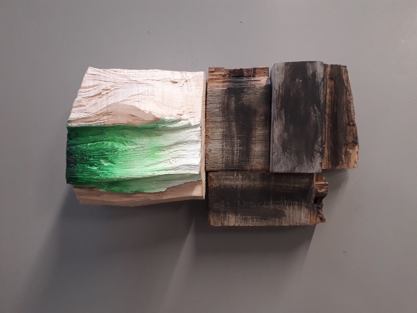 Ieder stuk hout heeft een andere, specifieke vorm die door hem, meestal met olieverf, naar voren wordt gebracht waardoor hij de verborgen verbeelding ervan zichtbaar maakt. Een eenvoudig maar doeltreffend beeld is bijvoorbeeld een scheef afgezaagd stukje afvalhout waarvan hij de bovenkant, de zijkant en de onderrand oranjerood heeft geschilderd. De nerven in het hout worden door dat geschilderde accent de bladzijden van een dichtgeslagen boek. Als je het ziet liggen wil je het openslaan om het te lezen. Het is één van de door hem gemaakte boekobjecten, uit wat hij zijn ’houten bibliotheek’ noemt. ‘Ik lees nog altijd gewoon papieren boeken. Lezen op de computer of op de telefoon vind ik onprettig.’