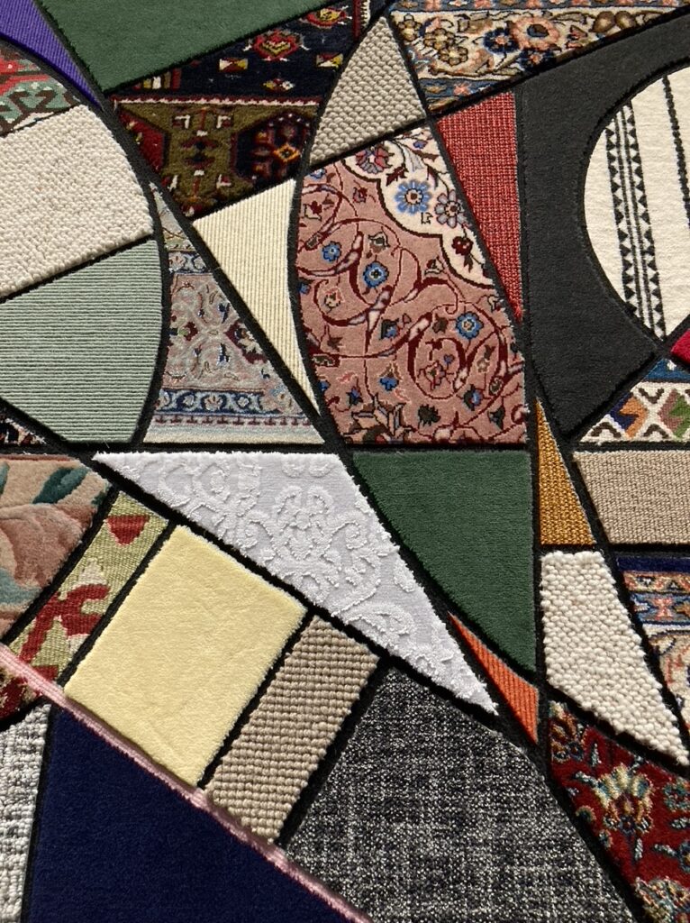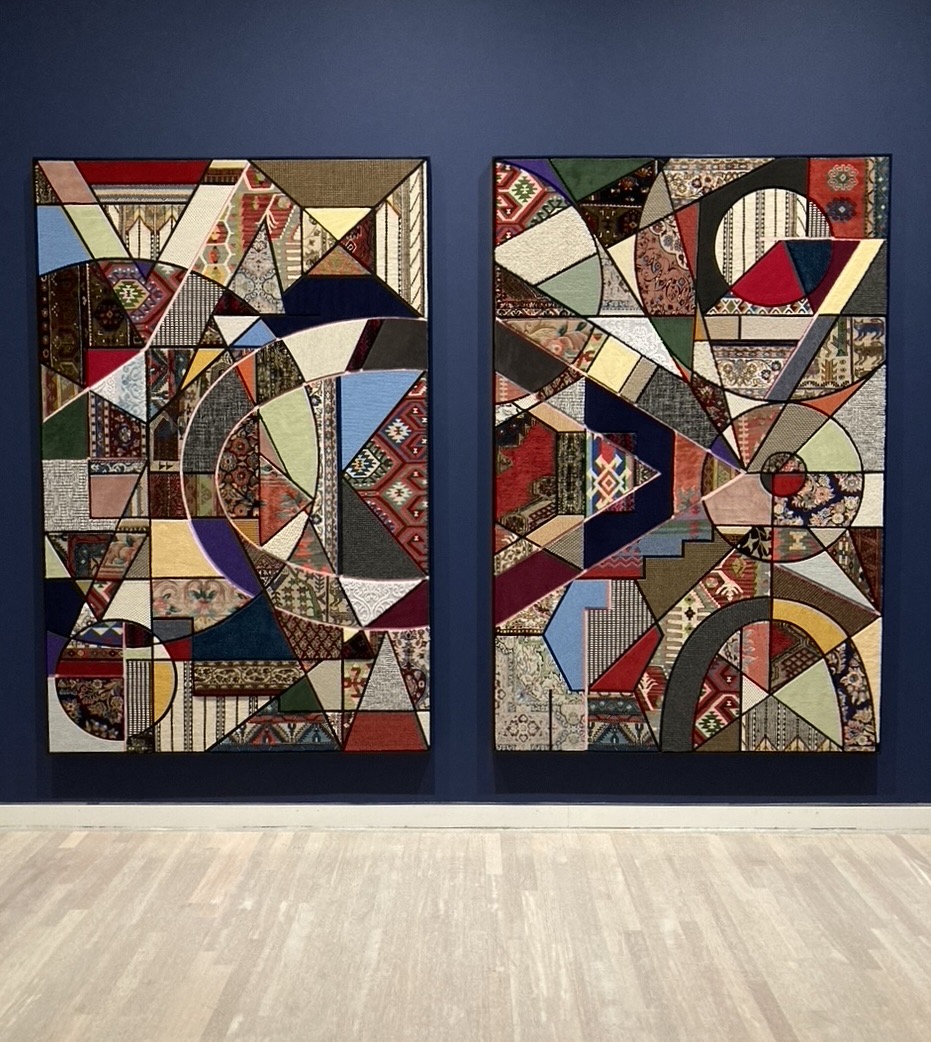 Eigenlijk is Social Fabric, pink bow and pink arrow geen tapijt, zoals drie andere werken in een zaal op de tweede verdieping van K20. Ik vind het mooi dat dit Düsseldorfse museum een deel ervan heeft ingericht voor tapijten omdat er in Nederland buiten het Textielmuseum niet veel aandacht is voor deze kunst- en werkvorm. (In het andere deel hangen tekeningen van Paul Klee.) Pink bow and pink arrow bestaat uit tapijtstukken op hout en ziet er daardoor steviger uit dan de drie andere, ‘echte’ tapijten. Het werk van de Turks-Duitse kunstenaar Nevin Aladaǧ (1971) is een tweeluik. Beide omvangrijke panelen, bedekt met kleurrijke stukken tapijt, trekken de aandacht. De tapijtstukken vormen patronen van cirkels en hoeken die muzikaliteit uitstralen. Maar misschien krijg ik deze associatie door het ritmische getik afkomstig van een installatie een paar meter verderop.