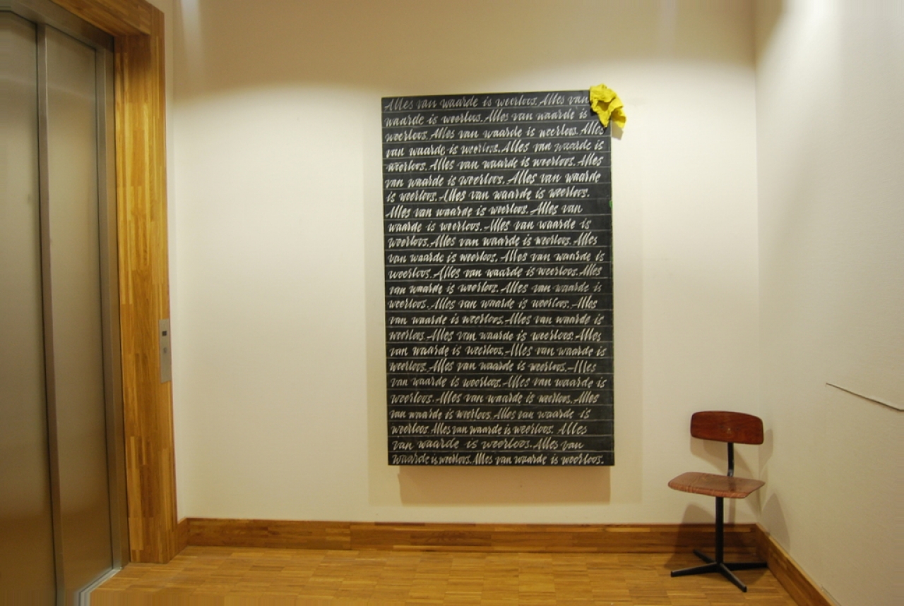 Het is opvallend dat krijtborden en krijt associaties oproepen met strafregels; een schrijfmateriaal waar slijtage en verval inherent aan is, dat symbool staat voor een discipinaire maatregel die er toe dient om goed gedrag in te prenten. Zoals Lucebert stelde is alles van waarde weerloos, maar eigenlijk heeft alles een zekere waarde. De krijt-objecten zijn weerloos tegen de frictie van het steen, en een krijttekening is onbestendig tegen een regenbui, of de tijd die de tekening laat vervagen. Iedereen die vroeger met pastelkleurig stoepkrijt een hinkelbaan voor de stoep van de buren heeft gekalkt, weet dit.