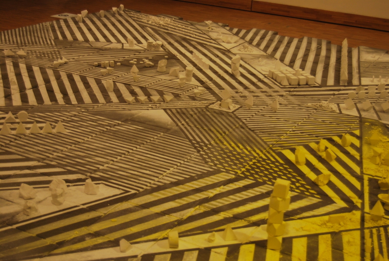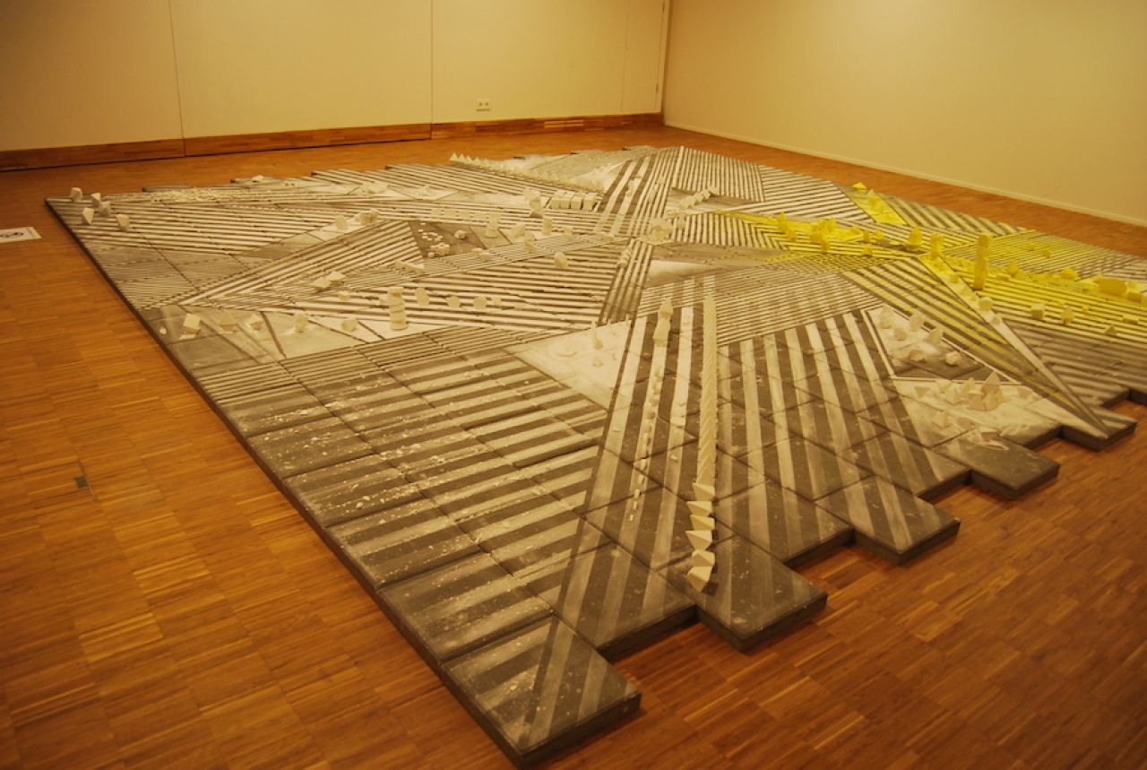 Bij stoeptegels in combinatie met krijt ben je al gauw geneigd om aan kindertekeningen te denken, maar er is bij Object Field iets anders aan de hand. Banen van lijnen in variërende diktes lopen parallel aan elkaar in strakke, hoekige vlakken. De gele strepen roepen het gevoel op van een waarschuwingsbord, maar een symbool of een aanduiding van gevaar is er niet. De compositie heeft iets gecoördineerds maar ook iets intuïtiefs in zich; een spel van lijnen en vlakken zonder een duidelijke logica, dat in een verveeld dromerig moment in een schriftje wordt gemaakt.