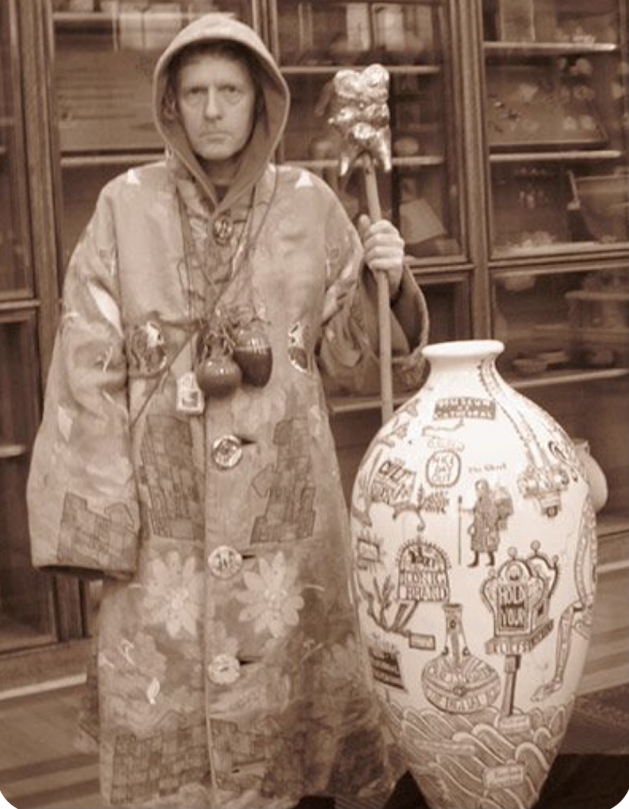 Niet alleen op zijn keramieken potten brengt Perry zijn boodschap de wereld in, maar ook gekleed in een uitbundige jurk of een betoverend geborduurd sjamanen kostuum, als zichzelf in alle identiteiten die hij in zich draagt: queer, kunstenaar en kwetsbare ziel.