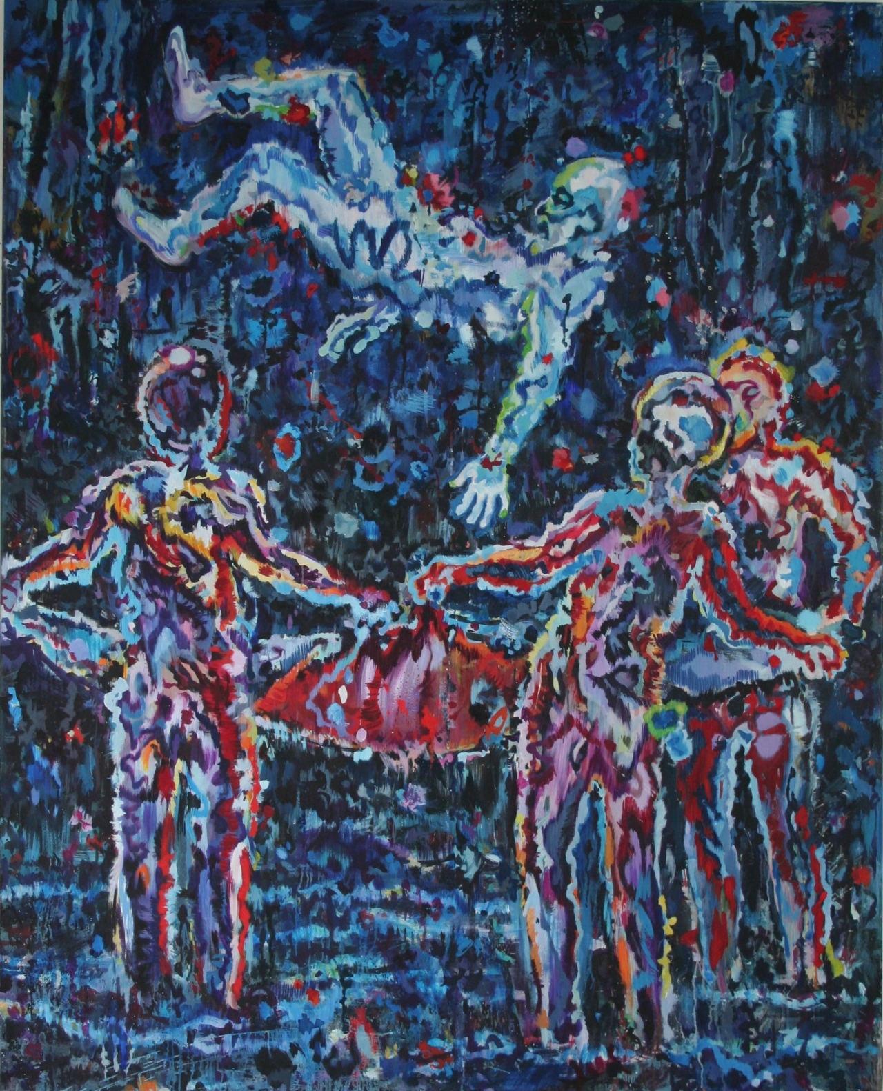 In twee recente schilderijen heeft Sieberen de Jong een werk van Francisco de Goya als uitgangspunt genomen. Een aantal figuren jonassen een ledenpop op een kleed de lucht in. Het is een vorm van duivelsuitdrijving die bij gebrek aan een bezeten mens met een pop wordt uitgevoerd. Het is een ritueel waarbij de mens het op speelse wijze mogelijk maakt met de eigen verwerpelijkheid om te gaan. Zoals de pop in de lucht wordt geslingerd, zo gaat De Jong om met zijn verf. “Ik begin door verf tegen het doek te smijten,” zegt hij daarover. Hij laat zich meevoeren door de verf dat in het luchtledige overeind wordt gehouden. Weliswaar is zijn werk figuratief, realistisch zou je kunnen zeggen, maar hij is in geen enkel opzicht een fijnschilder. Ieder detail in het werk is geen precieze weergave van de waarneming, maar een kleurige vlek die oplost in het doek. In zijn schilderijen gaat het erom hoe de vlekken op elkaar reageren en hoe ze daarin een balans vinden. Door fundamenteel vlekken, vormen en kleuren te schilderen – De Jong zet zijn werk niet in houtskool of een andere getekende vorm op – is alles aan zijn werk picturaal. Hij verwacht dat abstract werk van die werkwijze een uitkomst kan zijn. Een voorbode daarvan is het schilderij ‘The Kindness of Strangers’ naar de song van Nick Cave waarin de arme Mary Bellows met het tegenovergestelde te maken krijgt. Dat Sieberen de Jong zo’n gegeven niet inzet om een anekdotisch schilderij te maken toont dit doek. In een waterpartij worden stille getuigen weerspiegeld, die tegelijkertijd in, op en boven het water de onmacht van hun ‘kindness’ ten toon spreiden. Wat je ziet kan ook iets anders zijn.