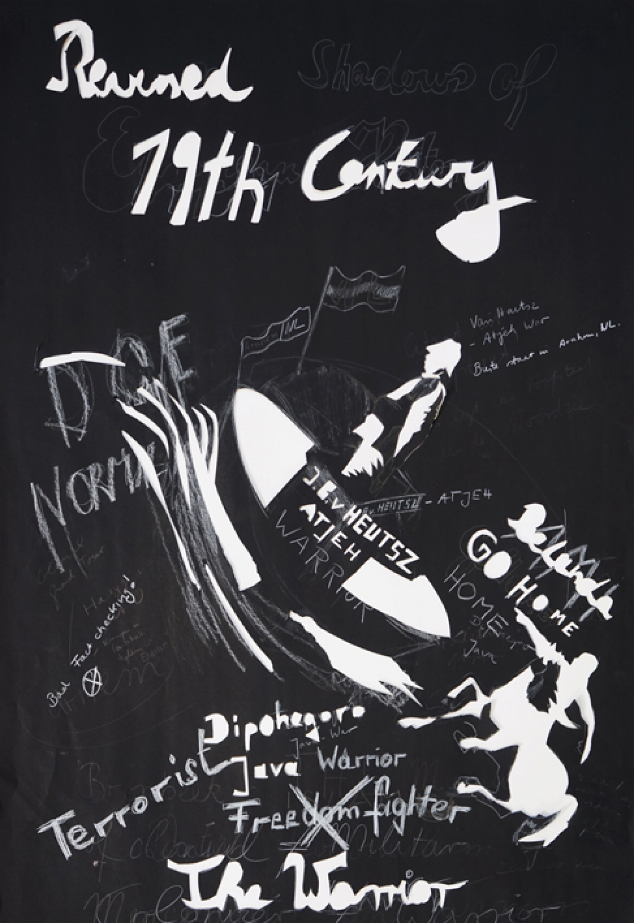 Hoe kun je de geschiedenis onderwijzen vanuit een globaal perspectief? Anneke Ingwersen onderzoekt op basis van archiefmateriaal hoe haar persoonlijke, culturele archief is gevormd door de eenzijdige verhalen uit Westerse geschiedenisboeken en hoe dit haar beeld op de wereld heeft gevormd. Verhalen waarin witte, mannelijke helden zoals Michiel de Ruyter domineren. Wat heb je nodig om te kunnen ontwennen van de vooroordelen die je zijn aangeleerd? Is het mogelijk om geschiedenislessen te ontkoloniseren? Vragen als deze krijgen vorm in haar werk Reversed Silhouettes of European History. Confronterende maar bovenal kwetsbare afbeeldingen zoals ‘My First Act of Racism’. Openhartige scènes gesneden in zwart papier.