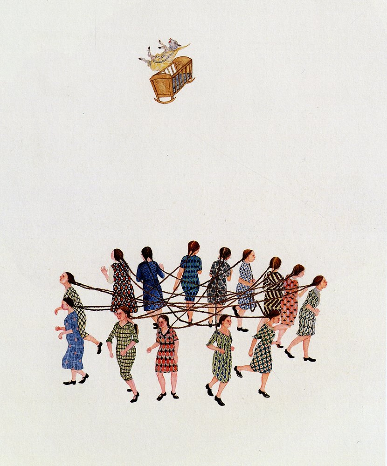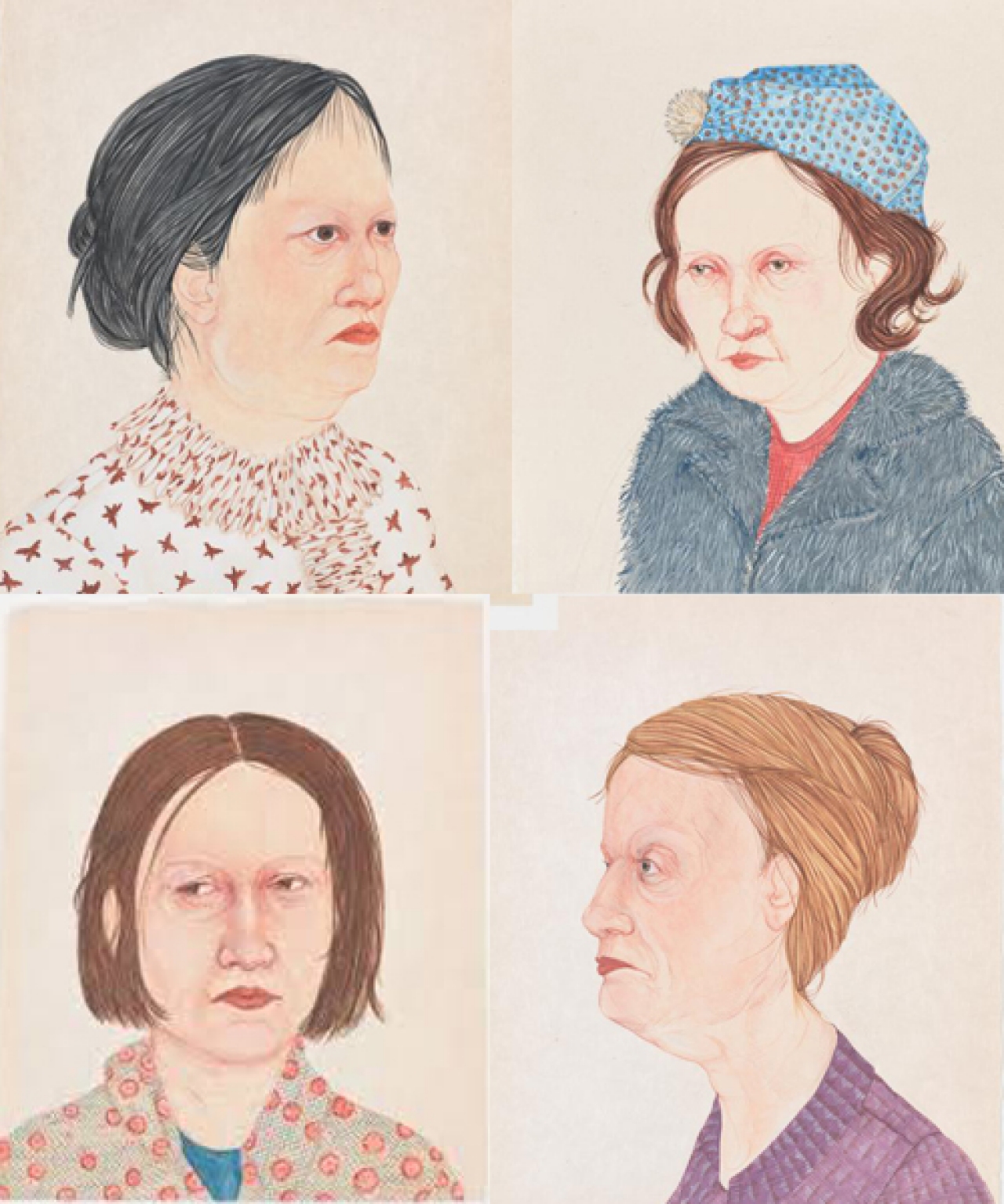 Als groep vertonen ze een absoluut ongemak, maar individueel lijken ze niet bepaald op elkaar. Ze zijn niet op specifieke bestaande personen gebaseerd, en ik heb ook geen modellen gebruikt. Ze kwamen tamelijk organisch tot stand, zonder schetsen of een specifieke compositie. Daardoor waren ze wat vreemd en verwrongen. Hun persoonlijkheid ontwikkelde zich terwijl hun gezichten een vaste vorm kregen. Ik dacht veel na over wat ze op hun hart hadden en over het soort leven dat ze eventueel leidden. Tegelijk met de ontwikkeling van hun karakter werd het duidelijk dat ze stuk voor stuk totaal verschillend gekleed moesten gaan. Het textielontwerp dat voor elke vrouw werd gekozen, was een afspiegeling van hun persoonlijkheid en van de emoties die in het gezicht waren terug te vinden.’