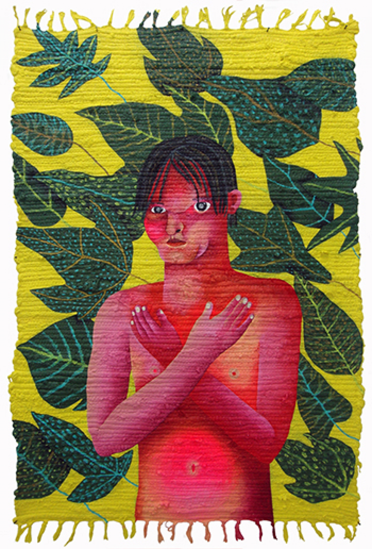 Dit zijn de schilderwerken van Anne Forest en ze hangen aan de wanden van kunstuitleen Heden in Den Haag voor de tentoonstelling All Souls. Forest schildert op tweedehands materialen. Het hoogpolige tapijt met zijn zachte structuur en de douchemat met het rafelende draad eisen van haar dat ze zich meer moet inspannen om de details zichtbaar te krijgen en de lijnen recht. Daarnaast brengen deze dragers een derde dimensie in haar werk, waardoor de voorstellingen fysiek meer diepte krijgen.