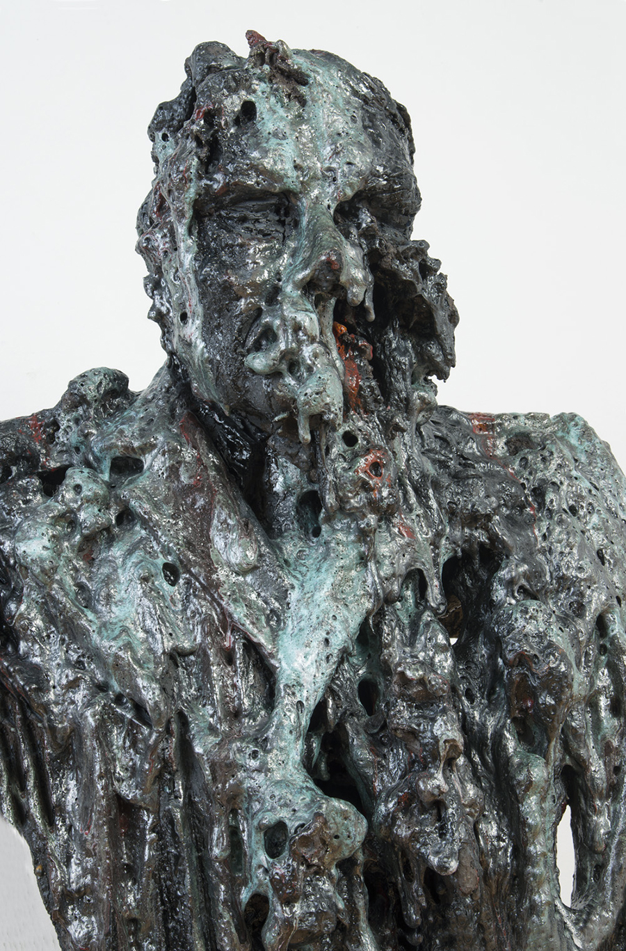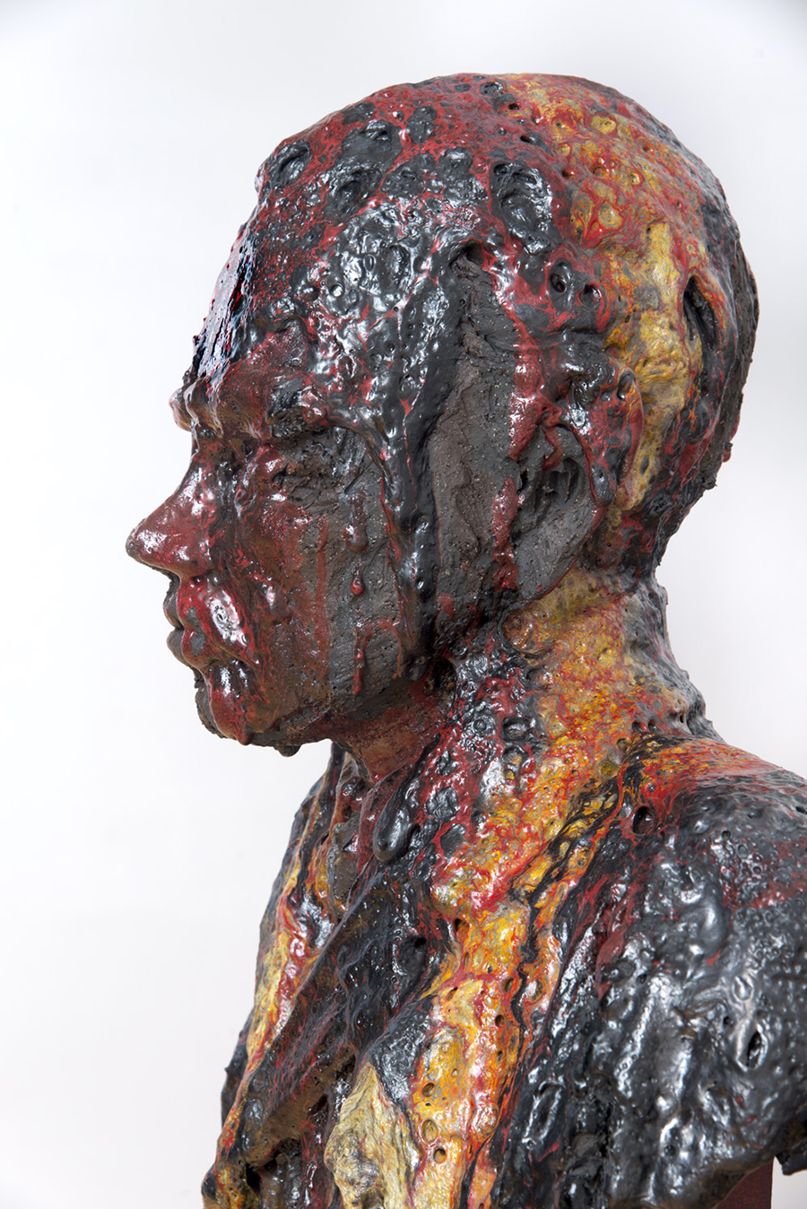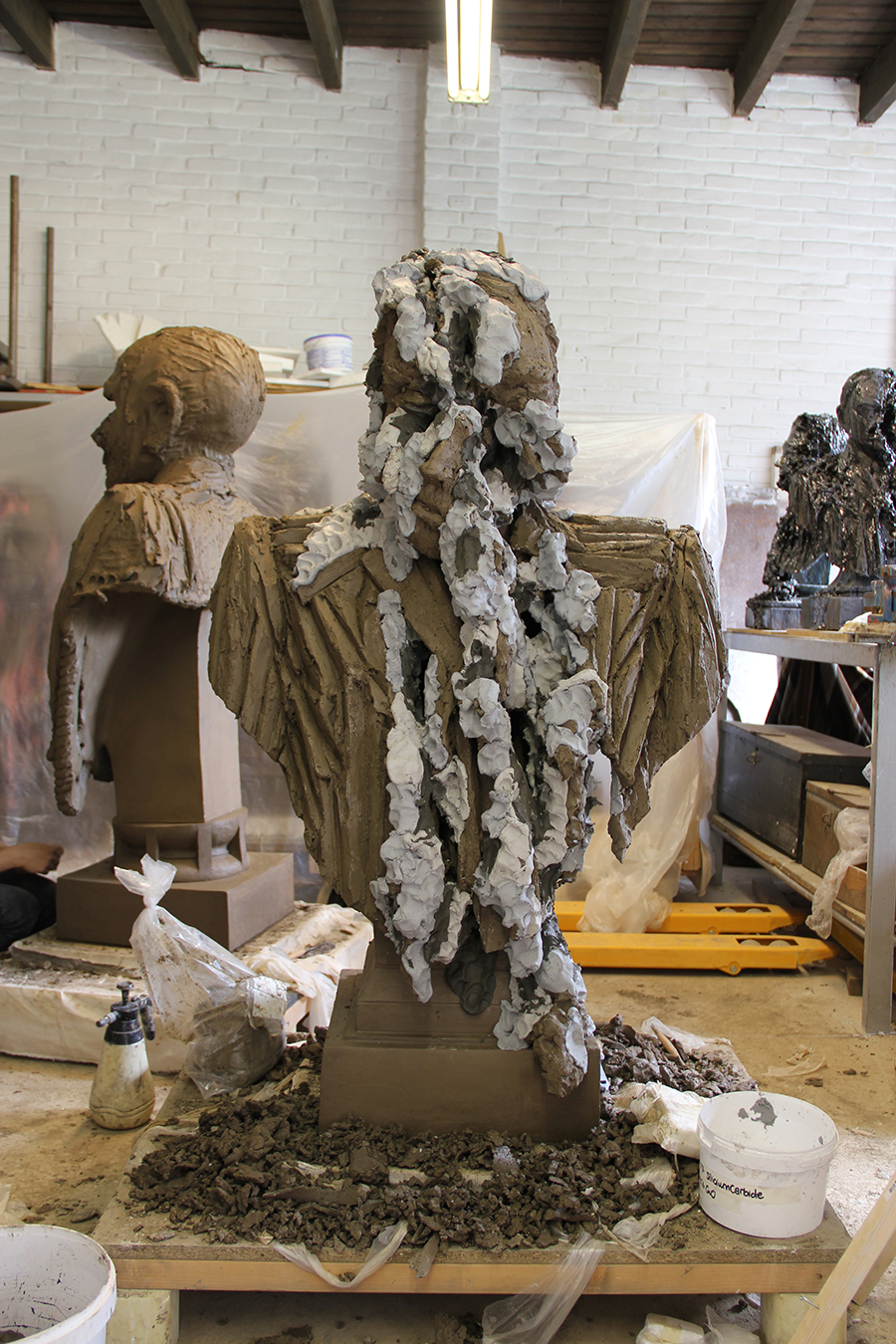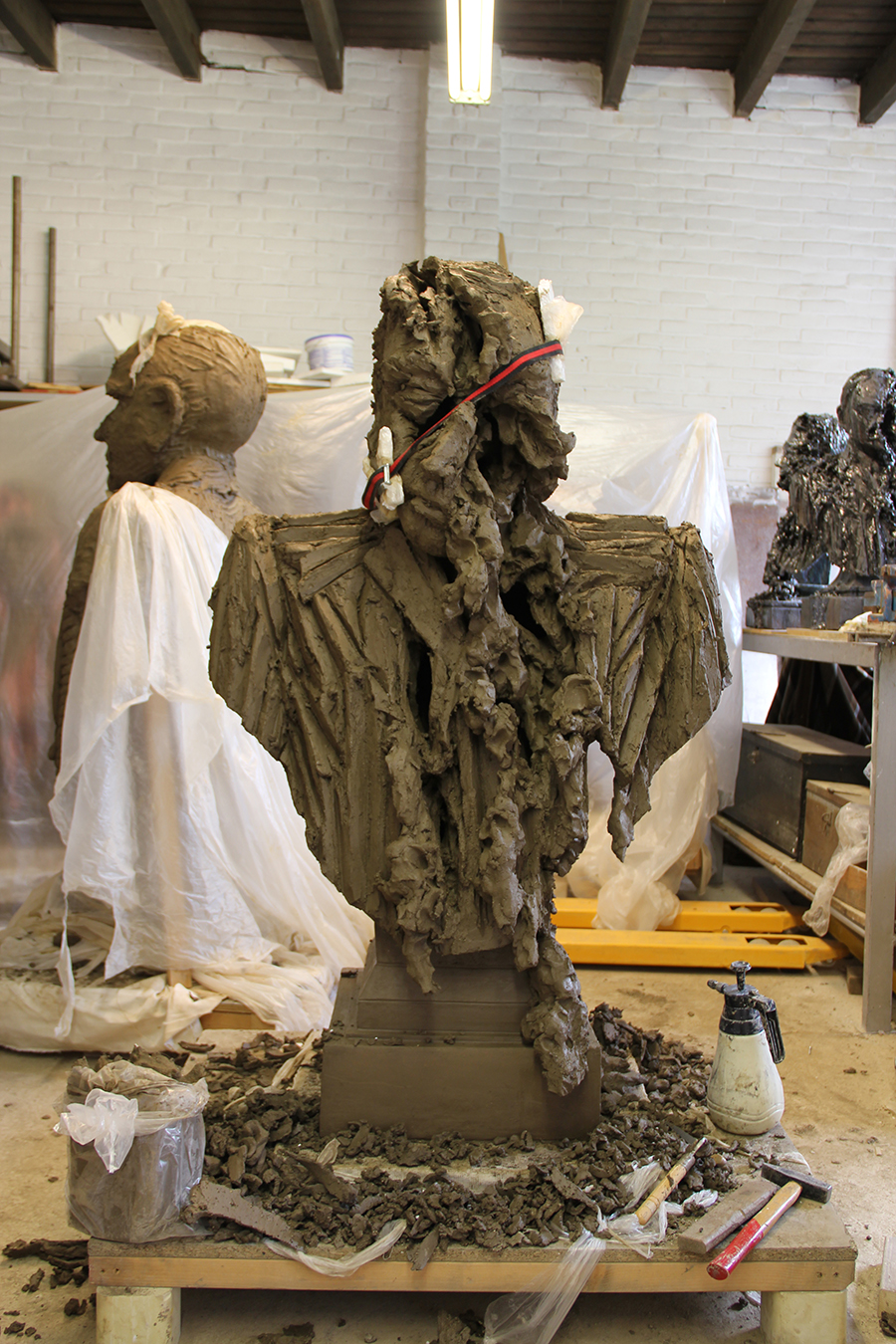 Dit universele beeld werd met klei zorgvuldig in het atelier opgebouwd om vervolgens doelgericht weer af te breken. Gaten er in te scheuren, delen weg te snijden. De gaten werden uiteindelijk weer gevuld met een zelf ontwikkelde schuimende klei die in de oven tijdens het stoken lava-achtig over het beeld ging stromen. Steeds op zoek naar de perfecte balans van de glorificatie van de macht als ook de betrekkelijkheid ervan.