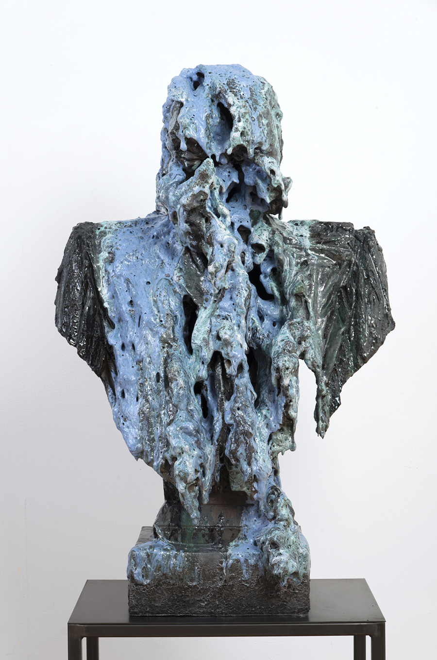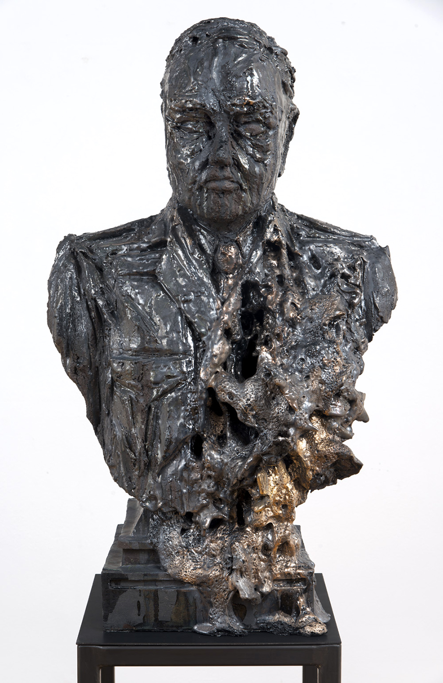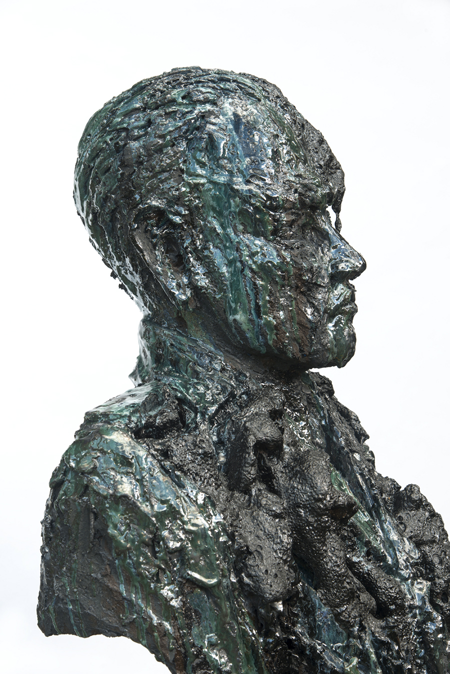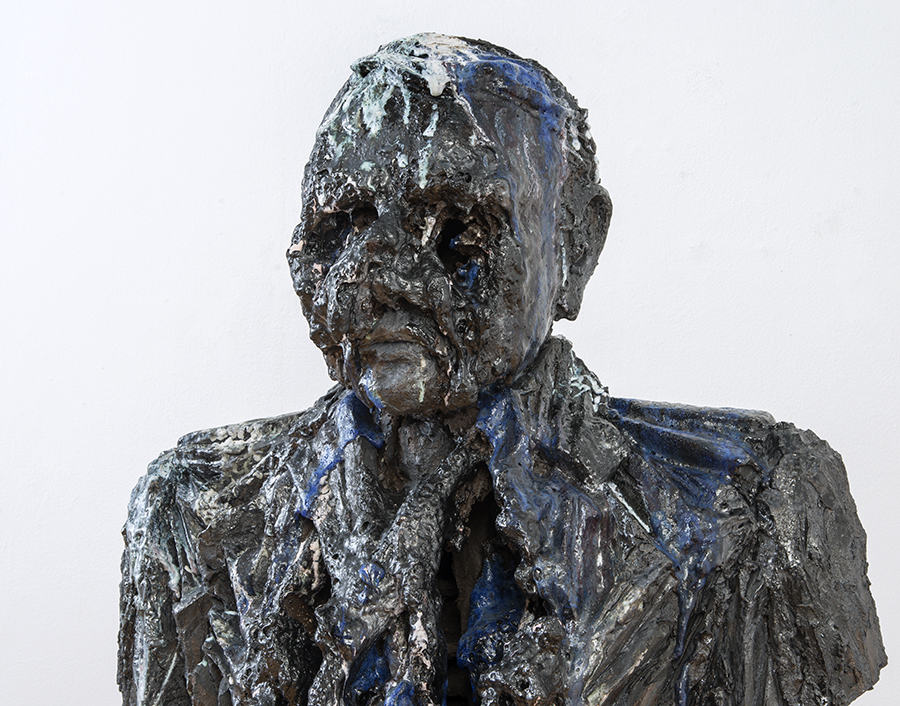 Dit universele beeld werd met klei zorgvuldig in het atelier opgebouwd om vervolgens doelgericht weer af te breken. Gaten er in te scheuren, delen weg te snijden. De gaten werden uiteindelijk weer gevuld met een zelf ontwikkelde schuimende klei die in de oven tijdens het stoken lava-achtig over het beeld ging stromen. Steeds op zoek naar de perfecte balans van de glorificatie van de macht als ook de betrekkelijkheid ervan.