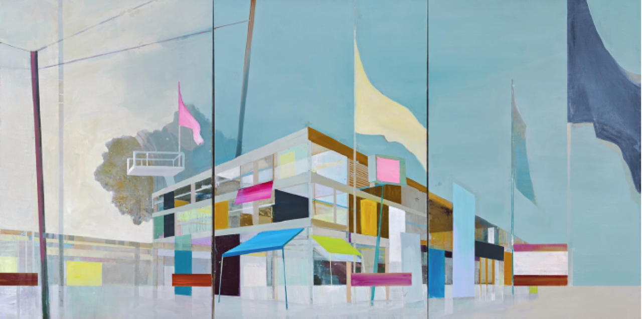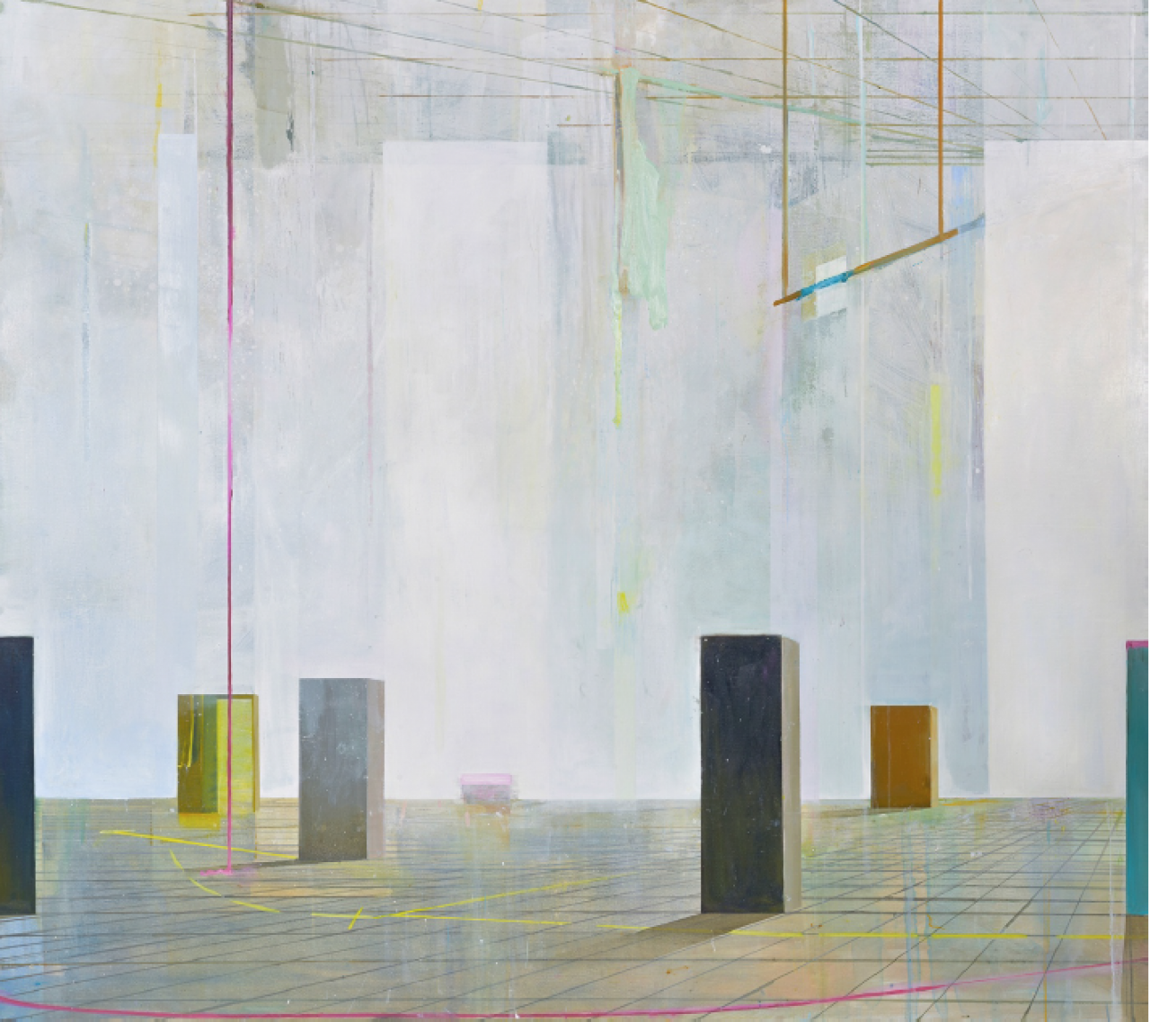 Voor de schilderijen van Annemieke Alberts geldt dat ze in architecturale zin een navolgbare gedaante hebben. Je kunt je er een voorstelling van maken hoe de gebouwen die ze schildert kunnen worden bewoond en beleefd. Tegelijkertijd maken ze de indruk ontwricht te zijn, alsof in die gebouwde structuren ruimtes openen die zich niet door vloeren, plafonds en muren laten begrenzen, maar als fata morgana gestalte krijgen, als een zindering van warmte in de atmosfeer. Zij haalt de kou uit de lucht. Het is een vorm van die resonerende energie die weliswaar wordt opgeroepen door de verf en het doek maar die zelf niet tastbaar is weergegeven. In het luchtledige dat door het schilderij wordt opgeroepen komt de geschilderde ruimte pas zichtbaar tot stand. Daardoor heeft de architectuur en de stedenbouw die Annemieke Alberts schildert een onwerkelijk gehalte, terwijl vrijwel ieder element zich ook concreet laat benoemen. Toch overheerst de sferische kwaliteit van het werk. Ze schuift daartoe in haar schilderijen uiteenlopende onderdelen in elkaar, zoals in het schilderij ‘Laundry’ waarin wit wasgoed, lijnen van een sportveld, witte hekken, staande balken, wanden en muren, landschappelijke lichtval en luchten en andere beeldelementen met hun concrete vormen juist een onbepaalde aanwezigheid veroorzaken. Er hangt iets in de lucht. Het is de presentie, de tegenwoordigheid van geest van jezelf die door ernaar te kijken in het schilderij wordt veroorzaakt. Je kunt er wel buiten blijven, maar daarmee dring je niet tot het schilderij door. Als de intentie is in het schilderij manifest te zijn, kun je erin plaats nemen en je er doorheen bewegen. Dat betekent ook dat je vanuit het schilderij de totstandkoming ervan kunt bekijken. In feite zie je hoe je door de schilder wordt gezien. Die omdraaiing van wat er op het doek te zien is, maakt de manier waarop jezelf de werkelijkheid ondergaat tot onderwerp van dit werk. Je weet ook dat je het anders ervaart dan Annemieke Alberts die in haar schilderijen met verf door de ruimte zwierend als een trapezeartiest het kijken een vrij zwevend gehalte geeft.