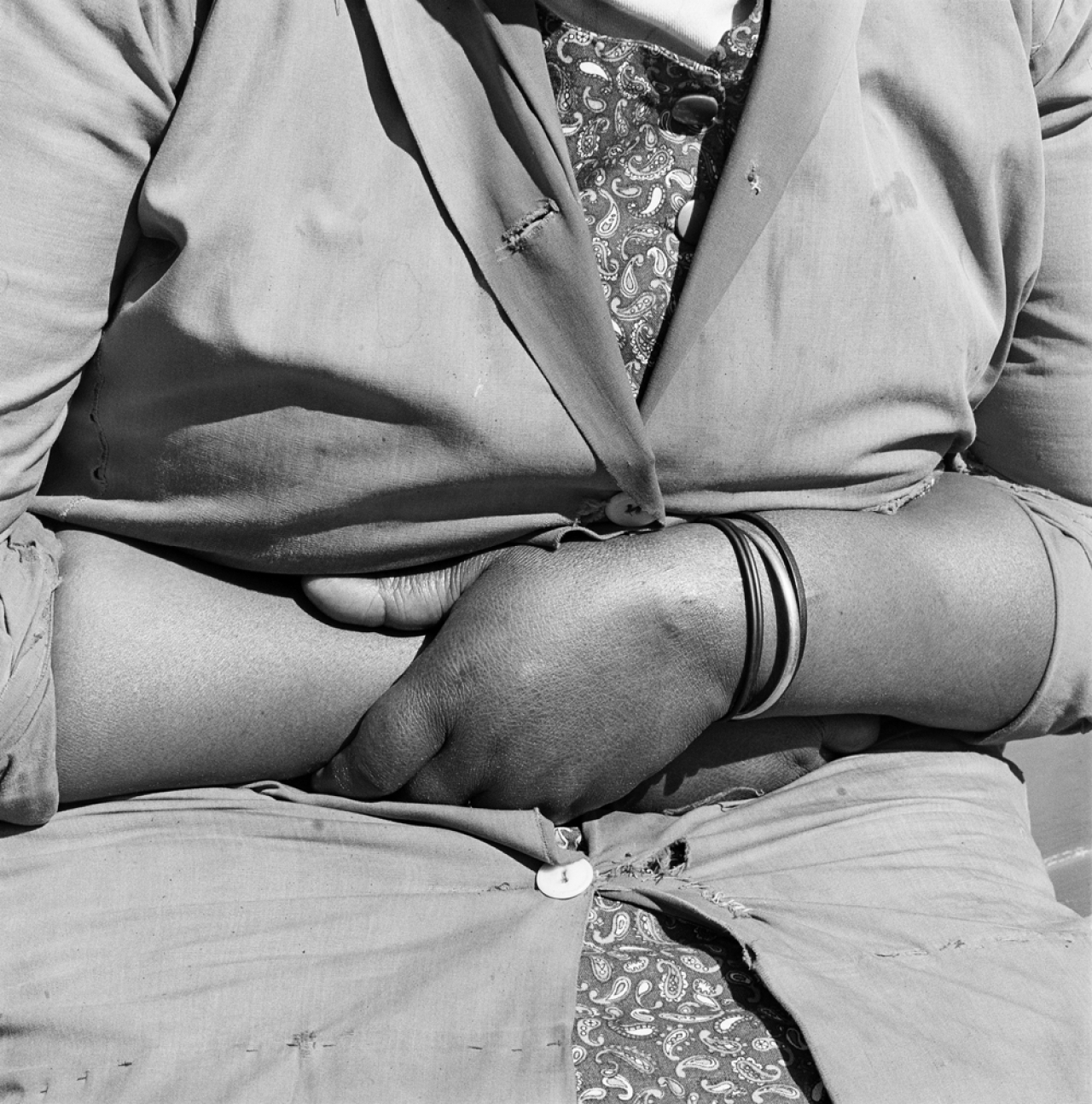 De foto’s van David Goldblatt leiden de tentoonstelling in met een treffende tegenstrijdigheid: schitterende close ups van enkel lichaamsdelen die boekdelen spreken. De verschillende huidskleuren, kleding, houding en positie vertellen het verhaal van de verschillende culturen die samenkomen ten tijde van apartheid in de parken van Johannesburg, de Free State en andere delen van Zuid Afrika. De serie publiceerde hij in 2003, maar dateert uit omstreeks 1980. ‘Particulars’ heten de detailbeelden. Een foto van een strakke witte steunkous knellend om een iets te dik zwart been: letterlijk benauwend.