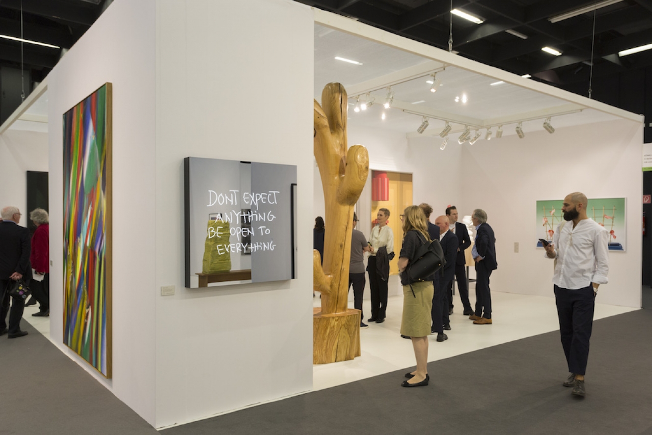 Even before entering the fair we can feel the grandiosity of itself by the carpet artwork made at the entrance by artist Zuzanna Czebatul. Once inside we went up to the top of the fair to start, getting to the youngest galleries and facing the collaborative both of Fons Welters and Isabella Bortolozzi as soon as we step out of the escalators, with an amazing presentation of 3 huge canvas of Juliette Blightman laying on crates of beer and some new wall work by Olga Balema. It is in this top floor were we find not only the collaborations section, with highlighted booths such as Arcadia Missa and Deborah Schamoni, featuring some work by Judith Hopf or the collaborative booth of Weiss Falk and Gillmeier Rech where wall works and works turned in furniture by Veit Laurent Kurz worked perfectly in this fair context, but also were we find the Nieuwmarkt section with some young galleries that are showing some of the most interesting work at the moment, like the work of Peppi Bottrop and Tobias Spichtig at Jan Kaps (with a show in the gallery at the same time), the amazing paintings of Veronika Hilger at Sperling (that sold completely) or the simple but funny proposal by Rob Tufnell with the work of Edward Kay.