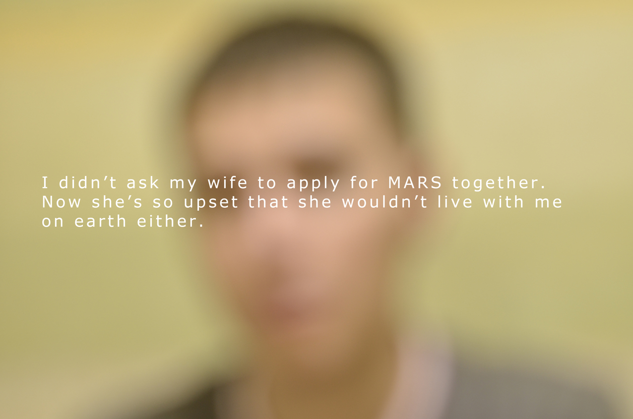MvZ Twee Nederlanders willen een kolonie stichten op Mars ergens in 2025 dacht ik.  Mensen van over de hele wereld konden zich door middel van een zelfgemaakt filmpje aanmelden voor een enkele reis naar Mars volgens ‘Mars One’. Die mensen moesten verschillende vragen beantwoorden, waaronder een vraag naar hun gevoel voor humor. Ik vind het gegeven fascinerend en belachelijk tegelijkertijd en in dit werk ben ik opzoek gegaan naar de balans daartussen. Wetenschap en emotie komen hier heel dicht bij elkaar. Nu ben ik bezig om een groter werk te maken over het verlangen om Mars te veroveren. Ik ben met verschillende beelden die ik van internet haal aan het experimenten. Het is nog niet duidelijk wat ik met dat materiaal wil doen. Misschien wordt het wel een boek.