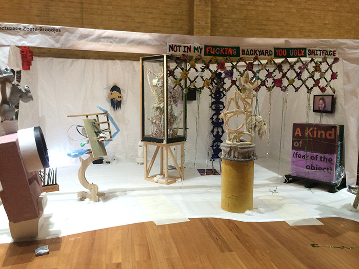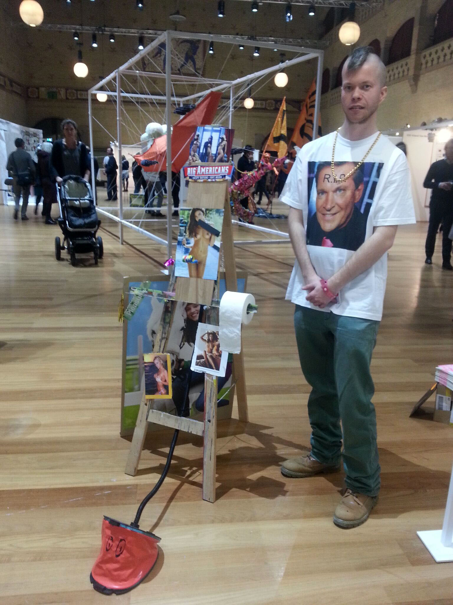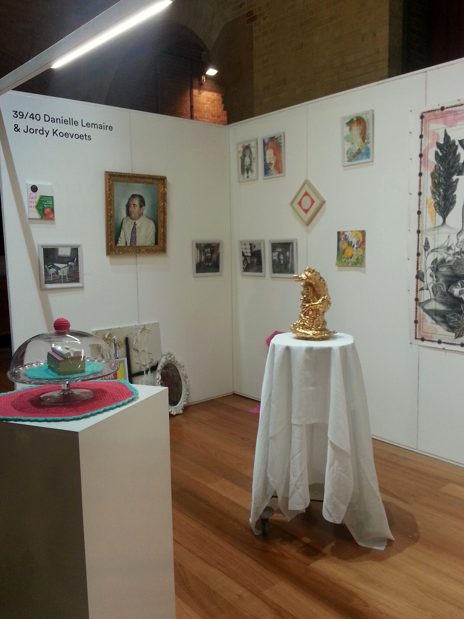 Jordy Koevoets breekt de maatschappij open en legt onderwerpen bloot die onze samenleving voor een groot deel definiëren: consumentisme, oppervlakkigheid en seks. Danielle Lemaire, de vrouw van zijn voormalige kunstdocent, deelt met hem een stand en toont voornamelijk schilderijen die intiem en uitgebalanceerd aandoen. Een verrassende clash waarin een balans is gevonden tussen vredigheid en luidruchtigheid is het resultaat. De grotendeels kaalgeschoren schedel van Koevoets verbergt niet zijn twijfelachtige, haast beschaamde manier van spreken over de taboes die hij aankaart in zijn kunstwerken. De Action is een inspiratie voor Koevoets: ‘Ik zou er een boek over kunnen schrijven. Bij het maken van mijn kunstwerken incorporeer ik objecten die er te koop zijn. Alle producten van de Action worden als mooi beschouwd door de kopers, maar vallen wanneer je thuis komt al uit elkaar.’