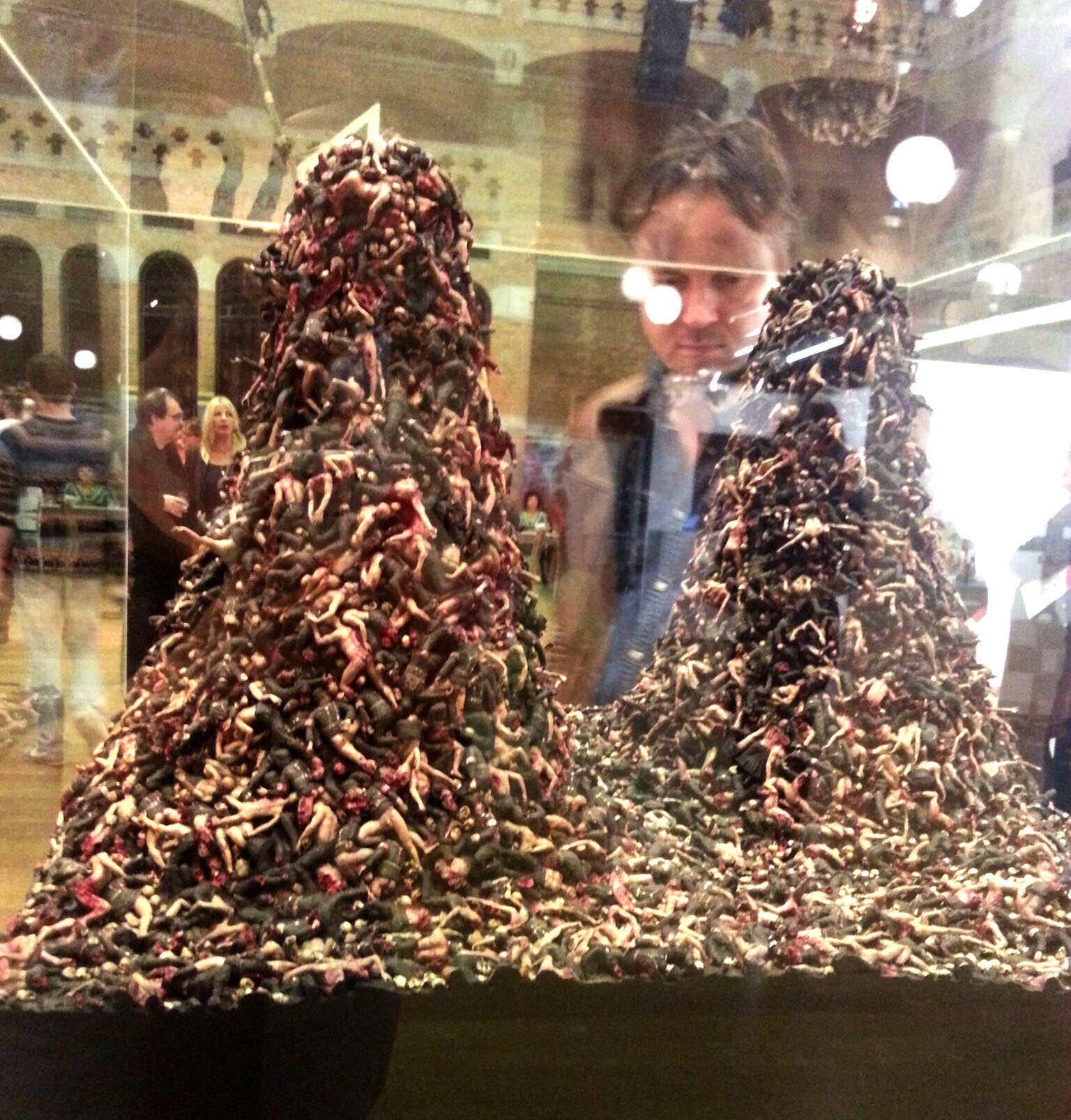 Naast hem staat één van zijn kunstwerken. Een hardroze, met glitters en diamanten beplakte Kalashnikov, waarop het gouden woord ‘DIVA’ schittert, siert een houten constructie waarop in zwarte letters de tekst ‘Wir sind alle krank’ is geschilderd. Aan de voorzijde staat naast een voetpompje een karton met de tekst ‘3 keer pompen voor tien euro’. Wie deze mogelijkheid aangrijpt zet een feesttoeter in het kruis van een door de Playboy gefotografeerde naakte vrouw in gang. Aan de rechthand van de toeschouwer hangt Wc-papier, ‘Mannen kunnen hiermee hun geslachtsdeel afvegen als ze klaar zijn.’