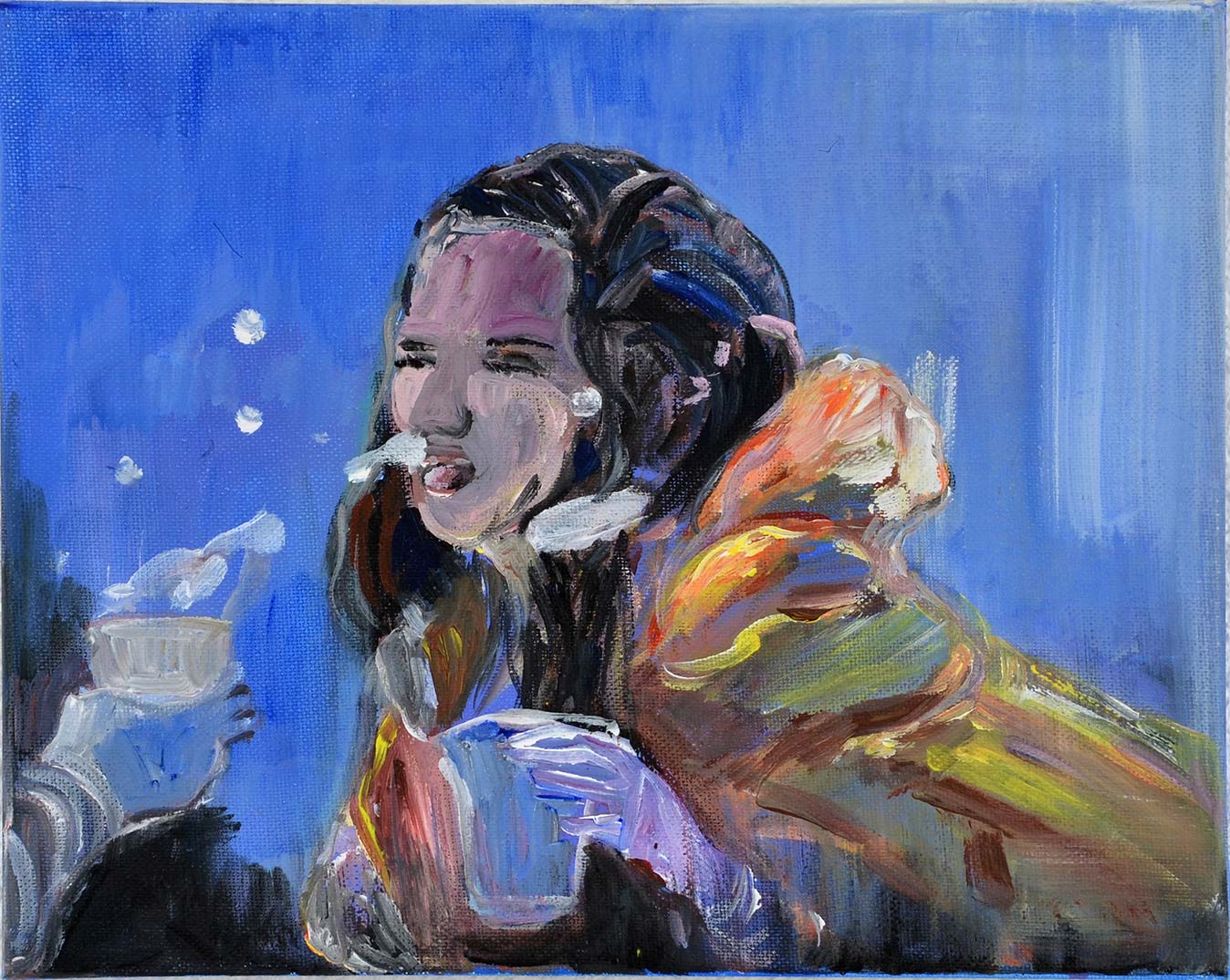 In het schilderen ontdekte Ineke Damen dat ze haar eigen stijl kon nastreven zonder zich iets aan te trekken van de werkelijkheid. Haar figuratie kent nauwelijks realisme in de zin van anatomisch correct weergegeven lichamen. Zij is in staat door vervorming van lichaamsdelen de geloofwaardigheid van haar figuren te versterken, een goed voorbeeld daarvan is de veel te lange linkerarm van een dansend meisje in ‘Announcement’. Die lange arm bevestigt de onbeholpenheid van alle andere onderdelen in het schilderij en brengt ze virtuoos met elkaar in evenwicht. Inmiddels heeft ze zo’n twintig kleine en grotere schilderijen gemaakt. De kleine doekjes tonen enkelvoudige onderwerpen zoals het in grijzen en spaarzaam roze uitgevoerde ‘Image’ waarop een tafelspiegel te zien is, of het in uitgesproken kleuren geschilderde portretje ‘Snowwhite’ waarin Sneeuwwitje een vloeistof in het gezicht gesmeten krijgt. Nu stak Ineke Damen zelf in haar jeugd met haar ranke gestalte, bleke huidskleur en ravenzwarte haar Sneeuwwitje naar de kroon en lijkt ze in dit semi-zelfportret een straf te ondergaan voor iets waar ze zelf niets aan kan doen.