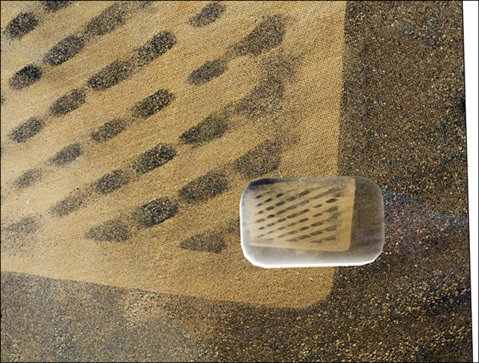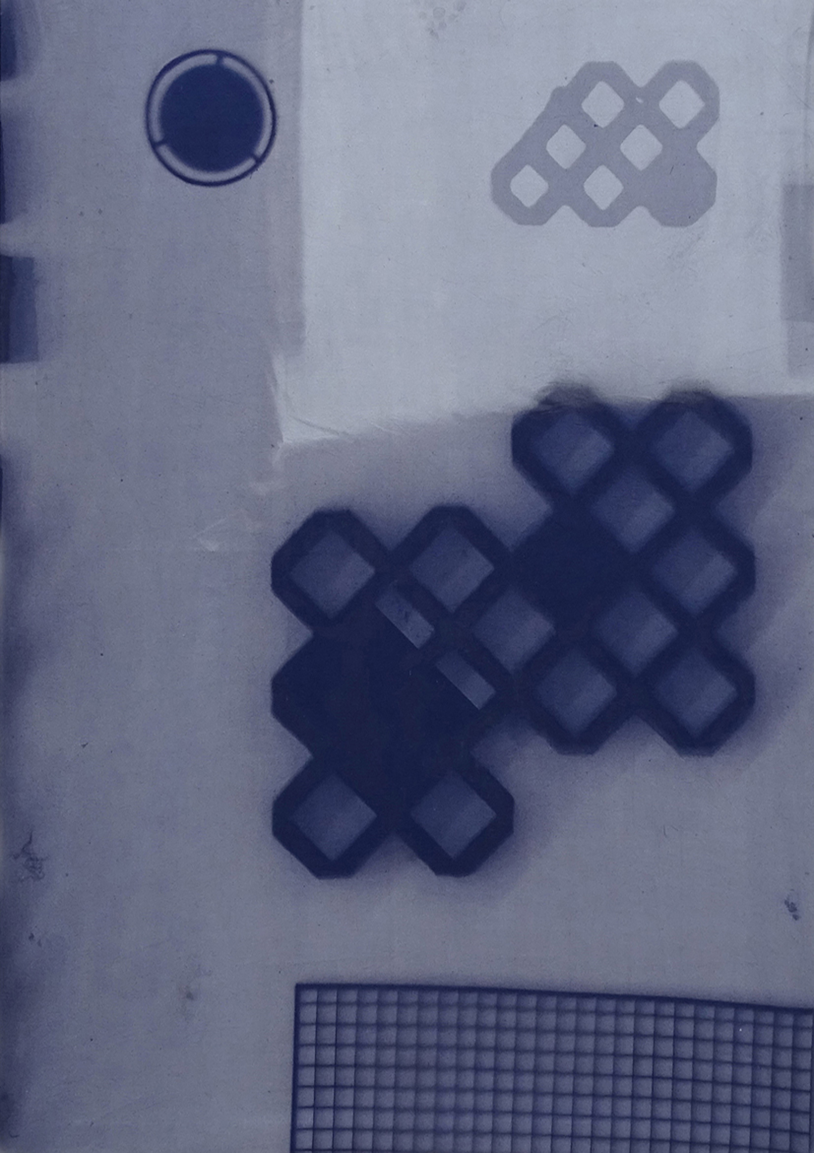 De afdruk van een laser-cut vorm in grijsbordkarton, of een leeg melkpak bijvoorbeeld. Zo nu en dan ga ik kijken hoe het er voor staat en verschuif ik wat objecten, of haal alvast iets weg. Het is vrijwel onmogelijk zo’n object precies op dezelfde plek terug te leggen dat maakt dat je soms mooie toon- verschuivingen kunt krijgen. Die zichtbaarheid van het spoor van die verschuiving op het doek maakt het juist vaak een spannend werk. Van veel doeken vind ik er steeds maar een paar goed. Op de meeste doeken zit te veel vogelpoep, of een spoor van slakkenslijm.