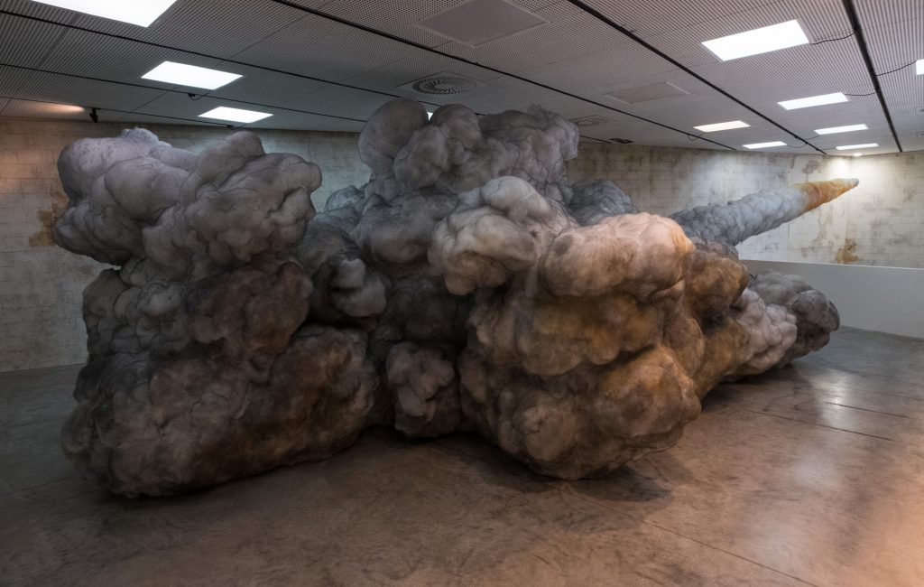 Toen ik het werk Sun stand Still (2017) van Gal Weinstein zag, stond ik oog in oog met mijn nachtmerrie. Van staalwol en piepschuim maakte Weinstein een meterslange en hoge grijze stofwolk. De structuur van de wolk was precies de structuur uit mijn droom. De vorm deed denken aan die van een Dust Storm Cloud. Toen ik bij het werk wegliep vroeg ik me af of Weinstein en ik dezelfde nachtmerrie hadden. Of had hij misschien met dit uitvergrote beeld een schrikbeeld gecreëerd waarin veel mensen, niet alleen ik, hun oerangst herkennen?