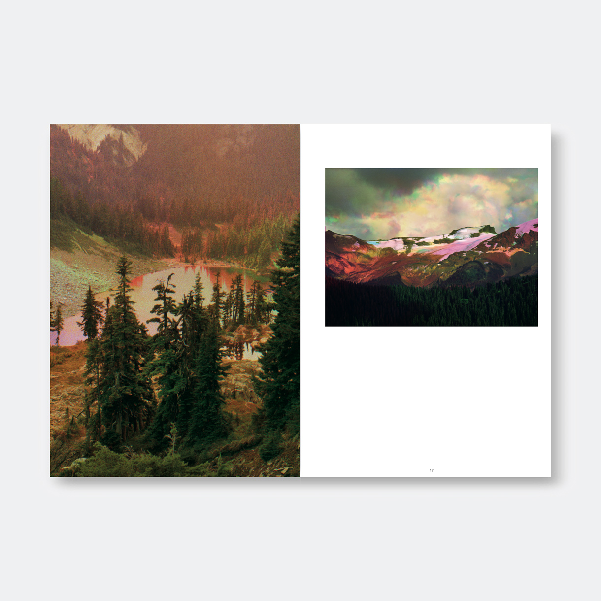 Op het idee van een spookkleur kwam ik door het fotoboek van Peter Funch The Imperfect Atlas (2019). Funch gebruikte in dit boek de fototechniek die voor de allereerste kleurenfoto’s werd gebruikt. Elke foto is opgebouwd uit drie foto’s met een afzonderlijke kleurfilter: een rode, een groene en een blauwe. De drie beelden samen maken de foto in full-color. Daardoor zijn niet alleen de kleuren representatief voor hoe we de kleuren normaal zien, maar het is ook door die kleuroptelling dat we diepte in de foto zien. Als de kleurfilters apart worden afgedrukt, zien we kleurvlakken zonder structuur of kleurschakering en daardoor zonder diepte. Daar speelt Funch heel mooi mee. Want doordat de foto’s uit drie aparte foto’s worden opgebouwd, zit er tussen de verschillende afdrukken tijd. Voor alles wat stilstaat maakt dat geen verschil maar voor de bewegende elementen wel. Bewegende mensen, auto’s, een vogel en wolken zijn op de drie afdrukken op verschillende plekken vastgelegd. De rode afdruk ligt daardoor net naast de groene die weer naast de blauwe ligt. Dat wat tijdelijk en bewegelijk is in het landschap, is een eendimensionaal kleurvlak geworden. De onbeweeglijke bergen en hoge pijnbomen zijn driedimensionaal. In een eeuwig landschap hangen de kleurvlakken als spoken in het luchtledige.