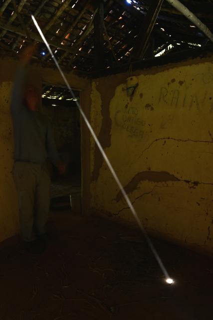 In de openingsscène van de film Leaning into the Wind: Andy Goldsworthy (2017) loopt de kunstenaar Goldsworthy door een vervallen en verlaten huis in de bergen in Brazilië. We zien details van het houtwerk van het dak en het staketsel van de stenen muren met houten frames. Hij kijkt van dichtbij naar de muren en strijkt met zijn vinger over het materiaal en zegt: ‘Deze plek is zo doorgedrongen van de aanwezigheid van mensen die hier zijn geweest. Hier zo staan heeft iets ongemakkelijks. Het is bijna té persoonlijk. Je krijgt hier een indringend kijkje in het leven van anderen.’ Dan zien we op de rommelige vloer een kleine witte cirkel. Op de donkere smoezelige vloer steekt het wit hel af. In een volgend filmshot wordt het beeld staand en zien we een stuk van het rieten dak. Dan begrijp ik dat de witte cirkel licht is. Als een spotlight, perfect rond schijnt er licht naar binnen. Opeens begint de cirkel te wasemen, er lijkt rook uit op te stijgen. Het wit is lila paars, zelfs een beetje blauw als de binnenkant van een vlam. De cirkel wasemt meer en meer en dan zien we de gehele lichtstraal als een lijn, schuin vanuit het dak vallen. Goldsworthy bezemt stof in de richting van de lichtcirkel en het stof maakt de baan die het licht aflegt zichtbaar in een pastelgrijze baan uit een bron van witgoud. Het stof dwarrelt en laat het licht vlammen en kronkelen als een geest. Alsof hij de achtergebleven adem van de mensen die dit huis bouwden, bewoonden, leefden en verlieten, zichtbaar maakt. De krioelende substantie van stof zorgt ervoor dat dit witgoud tastbaar is. Kleur maakt ruimte tastbaar en brengt de leegte zo dichtbij dat we dat wat verdwenen is, voorzichtig en zacht zouden kunnen aanraken. Iets wat we eigenlijk niet kunnen zien is intiem nabij gekomen.