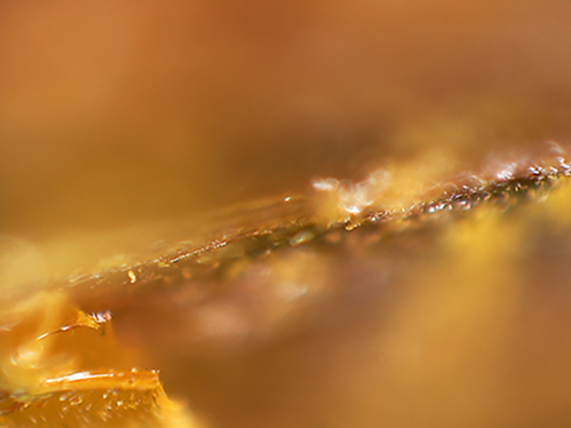 Het videowerk Balafre (2016-2017) van Susan Kleinberg vind ik net zo intiem als de serie van Sherman, terwijl deze video een close-up geeft van meteoriet van ongeveer 5000 jaar oud die in een kroon is gezet. De steen is gefilmd met een microscopische lens, en komt dus heel dichtbij, het is onmogelijk om wat ik in de video zie met het blote oog te zien. Vlijmscherpe hoeken en randen van het meteoriet blinken en kaatsen kleur. De diffuse omgevingskleuren gaan van goudgeel naar zonnegeel en oranje en verkleuren dan naar vloeiend grijs, paarsgrijs en zilver. Het is gelei, nat, droog, scherp, zacht en steeds veranderend. Onder de video heeft Kleinberg ‘the hum of the universe’ gemonteerd. Zwaartekrachtgolven die over 1,3 miljard jaar naar ons toe komen. Het is geluid en materiaal van uiterst ver dat via de blik door een microscoop en geluid via een koptelefoon mijn lichaam binnendringt. De meteoriet is mysterieus door zijn buitenaardse herkomst maar niet vies zoals de beschimmelde resten in de foto’s van Sherman, toch lijkt de intimiteit van de beelden op elkaar. Beide tonen door de close-up alles zo tastbaar mogelijk. Het is zo dichtbij dat we alleen nog wazige contouren zien en onze reuk- en tastzin onze informatie moeten aanvullen. Het diffuse karakter van deze kleuren bindt beeld en geluid aan mij.
